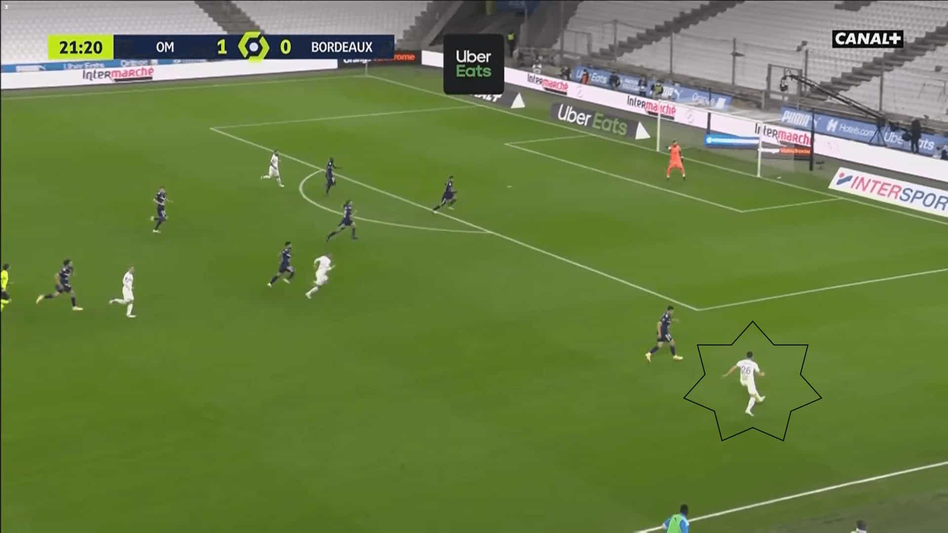 Having many players in the middle does not mean that they do not attack from the wings. It is the opposite because now the full-backs need to have an even greater attacking participation. In some situations, this formation is intended to portray that Marseille’s greatest strength is through the middle so that the opponent concentrates their defence there. Meanwhile, the full-back is making a run in behind.