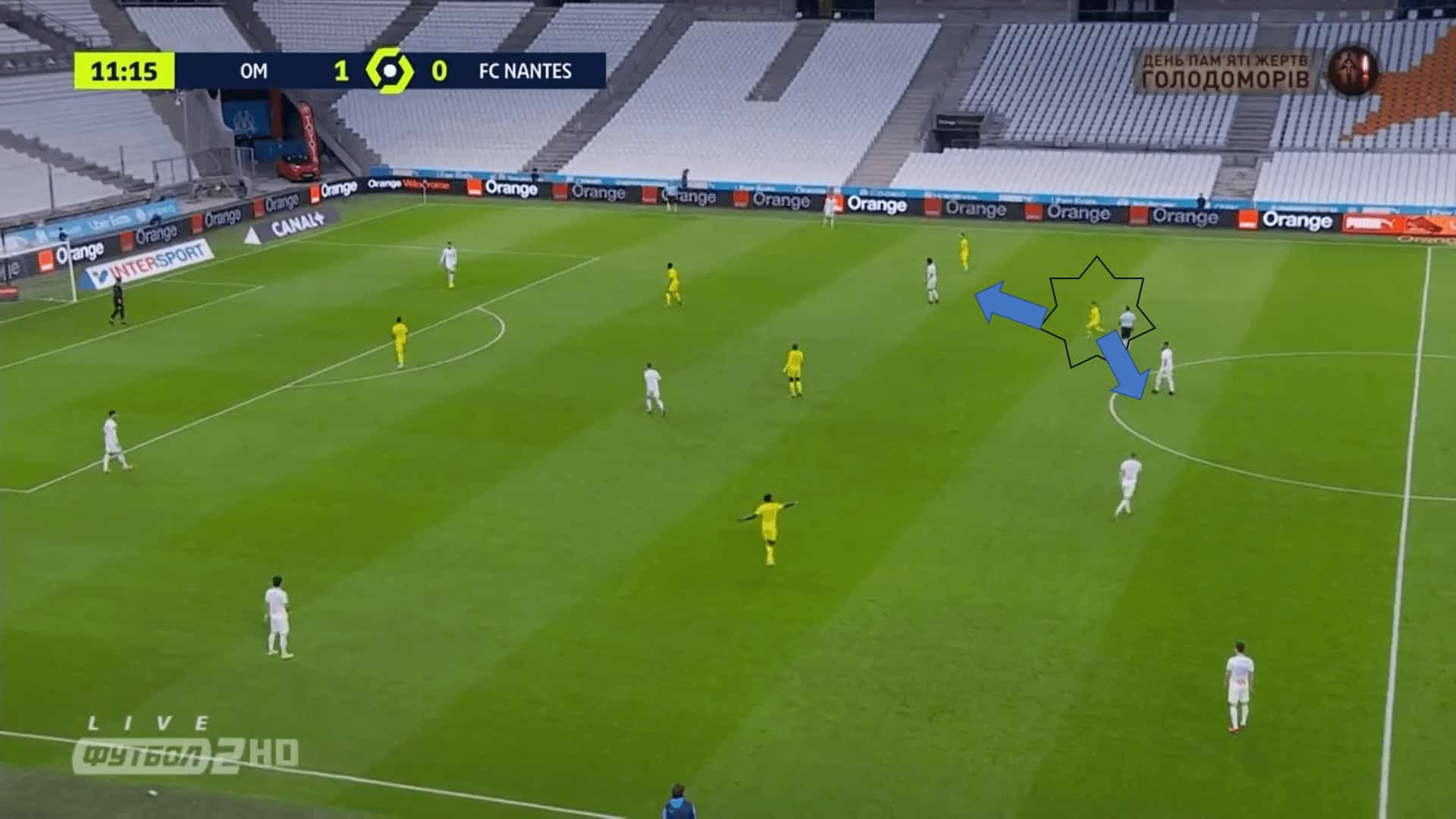 In the image below, it is clear how Marseille are in superiority and this makes some Nantes players have two players to mark. For example, the Nantes midfielder has to decide if he wants to press the Marseille midfielder or the left-winger. If he decides to be in between them and a pass is made to one of them, if Marseille play it quickly, they could easily get past this pressure.