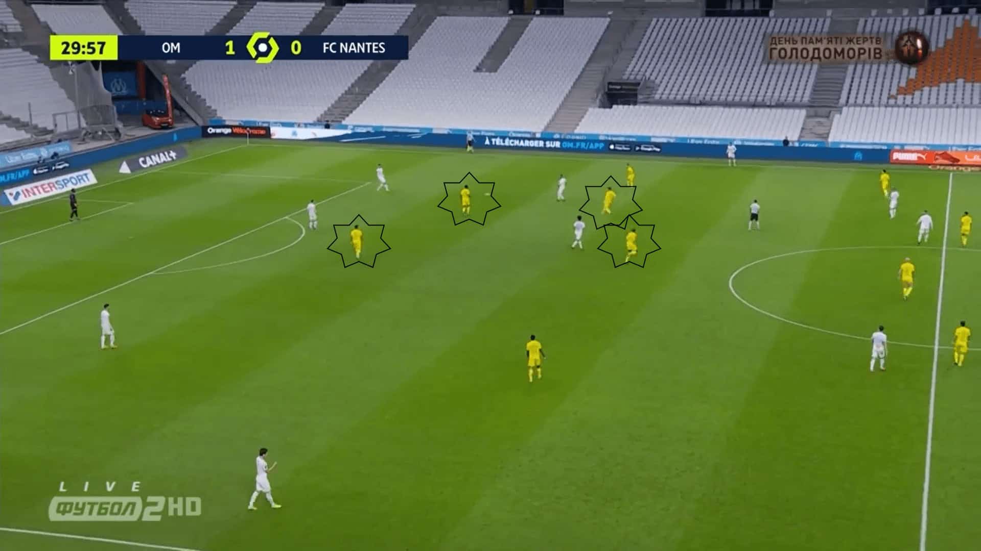 Then, both midfielders are marking the two pivots that came down to help. This is where one problem arose. Marseille knew that the Nantes midfielders would mark their pivots and so they put people in the middle behind these midfielders to be alone to receive the ball.