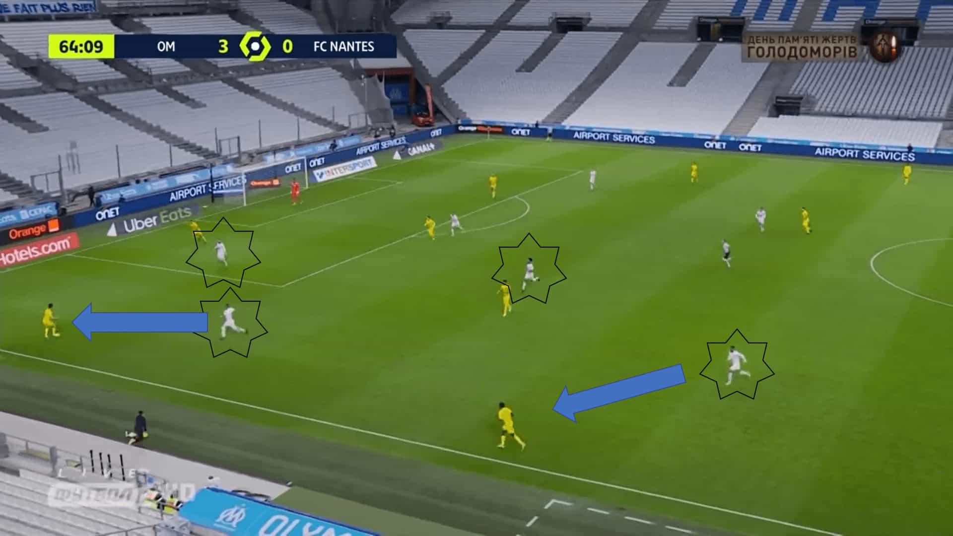 Either way, both of these actions mentioned would open up space elsewhere which means that the Nantes players pressuring high would have to be very intense to not let a pass go through to the Marseille players who are alone.