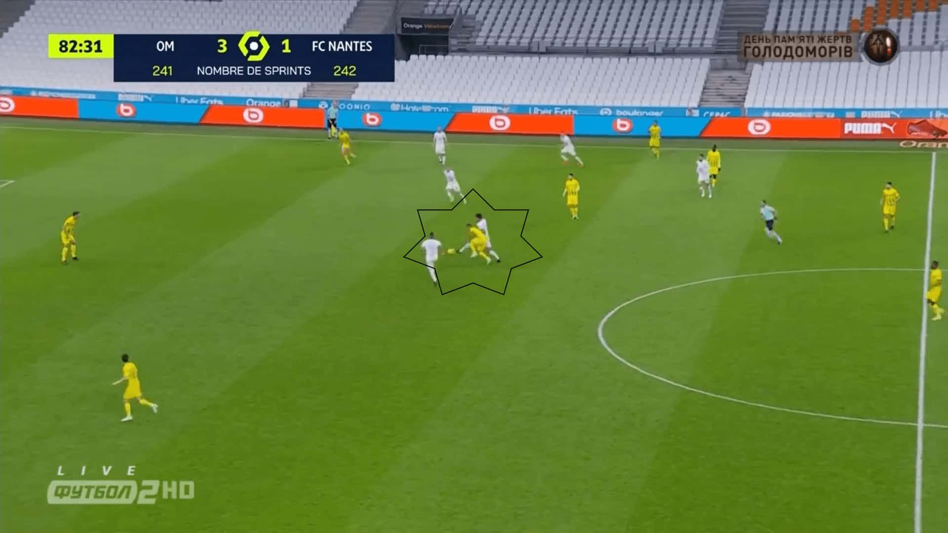 In fact, they recovered the ball high up the pitch a couple of times. For example, in the image below where the Marseille midfielder beats the Nantes midfielder to the ball, and it was the 82nd minute.