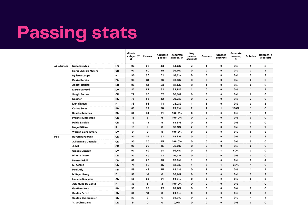 Sunday night saw <a href="https://totalfootballanalysis.com/category/teams/paris-saint-germain">PSG vs Auxerre</a> in <a href="https://totalfootballanalysis.com/category/competitions/ligue-1">Ligue 1</a>. We've broken down all the key <a href="https://totalfootballanalysis.com/match-analysis/free-download-premier-league-gw8-analytics-reports-data-viz-and-stats">stats</a> for you to digest in this tactical analysis and provide <a href="https://totalfootballanalysis.com/player-analysis/but-what-does-that-visual-actually-tell-us">insights</a> around; * shot maps * pass flow * heatmaps * defensive actions * average positions and much more! We also try to answer some questions for you with the visuals; Who was <a href="https://totalfootballanalysis.com/category/coaches/christophe-galtier">PSG's</a> biggest threat? Who made the most recoveries in the opposition half? Who had the highest xG in the match? To navigate the stats gallery simply click on the numbers to move through the pages. <a href="https://totalfootballanalysis.com/wp-content/uploads/2022/11/2-103.png"><img class="aligncenter size-large wp-image-354211" src="https://totalfootballanalysis.com/wp-content/uploads/2022/11/2-103-1024x683.png" alt="Ligue 1 2022/23: PSG vs Auxerre - data viz, stats and insights" width="640" height="427" /></a> <a href="https://totalfootballanalysis.com/wp-content/uploads/2022/11/3-105.png"><img class="aligncenter size-large wp-image-354212" src="https://totalfootballanalysis.com/wp-content/uploads/2022/11/3-105-1024x683.png" alt="Ligue 1 2022/23: PSG vs Auxerre - data viz, stats and insights" width="640" height="427" /></a> <a href="https://totalfootballanalysis.com/wp-content/uploads/2022/11/4-105.png"><img class="aligncenter size-large wp-image-354213" src="https://totalfootballanalysis.com/wp-content/uploads/2022/11/4-105-1024x683.png" alt="Ligue 1 2022/23: PSG vs Auxerre - data viz, stats and insights" width="640" height="427" /></a> <a href="https://totalfootballanalysis.com/wp-content/uploads/2022/11/5-104.png"><img class="aligncenter size-large wp-image-354214" src="https://totalfootballanalysis.com/wp-content/uploads/2022/11/5-104-1024x683.png" alt="Ligue 1 2022/23: PSG vs Auxerre - data viz, stats and insights" width="640" height="427" /></a><!--nextpage--> <a href="https://totalfootballanalysis.com/wp-content/uploads/2022/11/6-104.png"><img class="aligncenter size-large wp-image-354215" src="https://totalfootballanalysis.com/wp-content/uploads/2022/11/6-104-1024x683.png" alt="Ligue 1 2022/23: PSG vs Auxerre - data viz, stats and insights" width="640" height="427" /></a> <a href="https://totalfootballanalysis.com/wp-content/uploads/2022/11/7-104.png"><img class="aligncenter size-large wp-image-354216" src="https://totalfootballanalysis.com/wp-content/uploads/2022/11/7-104-1024x683.png" alt="Ligue 1 2022/23: PSG vs Auxerre - data viz, stats and insights" width="640" height="427" /></a><!--nextpage--> <a href="https://totalfootballanalysis.com/wp-content/uploads/2022/11/8-104.png"><img class="aligncenter size-large wp-image-354217" src="https://totalfootballanalysis.com/wp-content/uploads/2022/11/8-104-1024x683.png" alt="Ligue 1 2022/23: PSG vs Auxerre - data viz, stats and insights" width="640" height="427" /></a> <a href="https://totalfootballanalysis.com/wp-content/uploads/2022/11/9-104.png"><img class="aligncenter size-large wp-image-354218" src="https://totalfootballanalysis.com/wp-content/uploads/2022/11/9-104-1024x683.png" alt="Ligue 1 2022/23: PSG vs Auxerre - data viz, stats and insights" width="640" height="427" /></a> <a href="https://totalfootballanalysis.com/wp-content/uploads/2022/11/10-104.png"><img class="aligncenter size-large wp-image-354219" src="https://totalfootballanalysis.com/wp-content/uploads/2022/11/10-104-1024x683.png" alt="Ligue 1 2022/23: PSG vs Auxerre - data viz, stats and insights" width="640" height="427" /></a><!--nextpage--> <a href="https://totalfootballanalysis.com/wp-content/uploads/2022/11/11-104.png"><img class="aligncenter size-large wp-image-354220" src="https://totalfootballanalysis.com/wp-content/uploads/2022/11/11-104-1024x683.png" alt="Ligue 1 2022/23: PSG vs Auxerre - data viz, stats and insights" width="640" height="427" /></a> <a href="https://totalfootballanalysis.com/wp-content/uploads/2022/11/12-104.png"><img class="aligncenter size-large wp-image-354221" src="https://totalfootballanalysis.com/wp-content/uploads/2022/11/12-104-1024x683.png" alt="Ligue 1 2022/23: PSG vs Auxerre - data viz, stats and insights" width="640" height="427" /></a><!--nextpage--> <a href="https://totalfootballanalysis.com/wp-content/uploads/2022/11/13-103.png"><img class="aligncenter size-large wp-image-354222" src="https://totalfootballanalysis.com/wp-content/uploads/2022/11/13-103-1024x683.png" alt="Ligue 1 2022/23: PSG vs Auxerre - data viz, stats and insights" width="640" height="427" /></a>