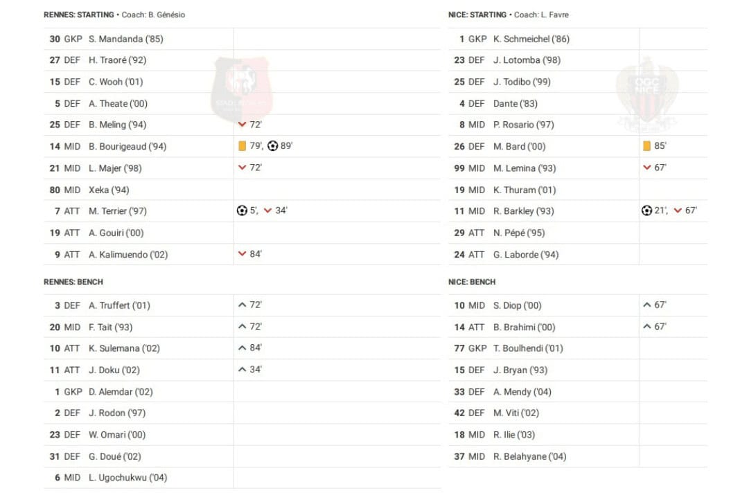 Monday saw Rennes vs Nice in Ligue 1.