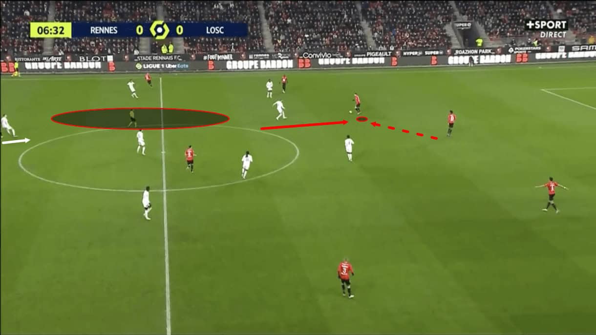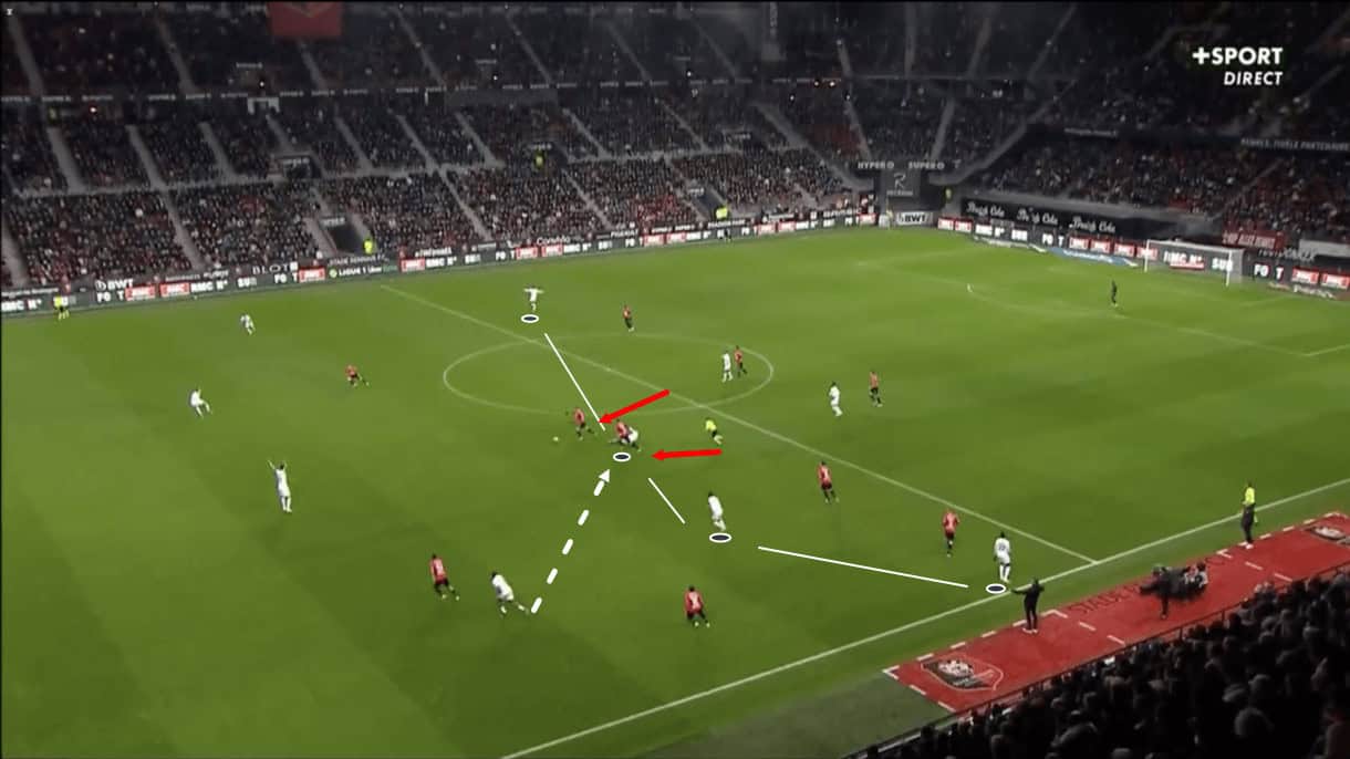 This helped to prevent a 3v2 from being created in favour of Rennes in this phase but, as previously mentioned and as is highlighted on figure 3, this also created space behind the aggressive midfielder and in front of Lille’s backline, and Rennes looked to exploit this space when it opened up on several occasions in this fixture — it was a clear plan for them to use this movement to create space and play through Lille’s shape.