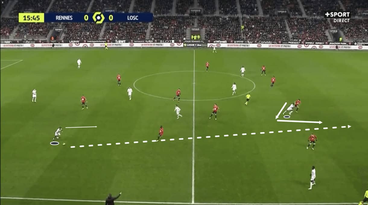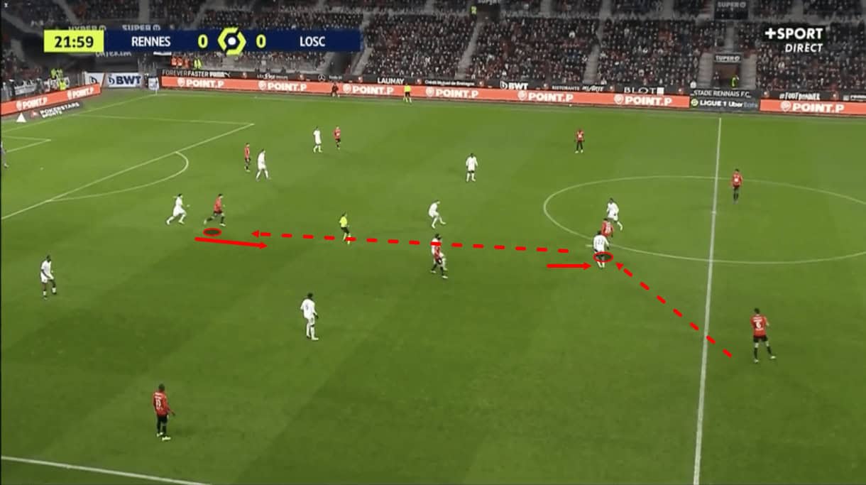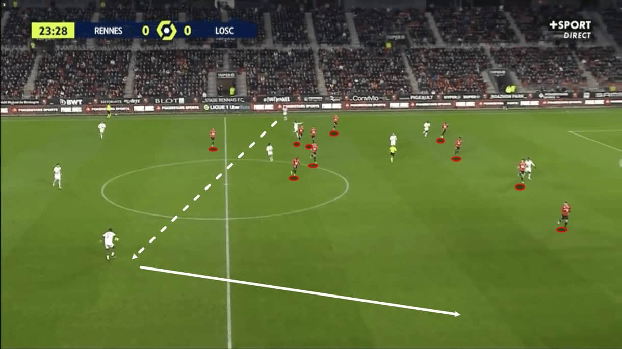 However, The negative of this system is that it leaves a lot of space open on the opposite side of the pitch for the team in possession to exploit via a switch of play. Lille didn’t make a lot of switches in this game — they didn’t have enough possession to do so — but when they did attack with the ball, they looked to exploit Rennes’ defensive system via their switches often. Les Dogues successfully created plenty of goalscoring chances via switches designed to expose an underloaded flank in this game.