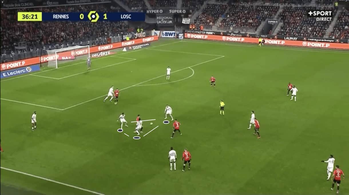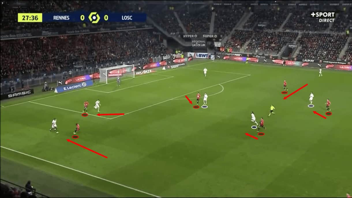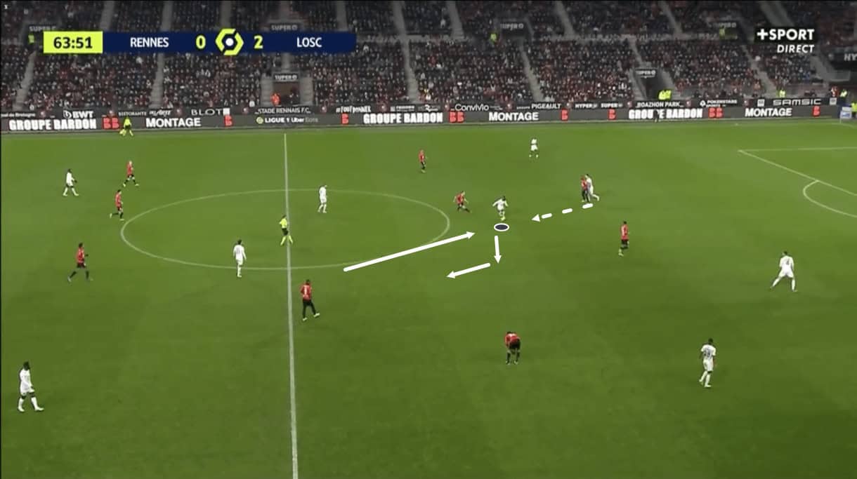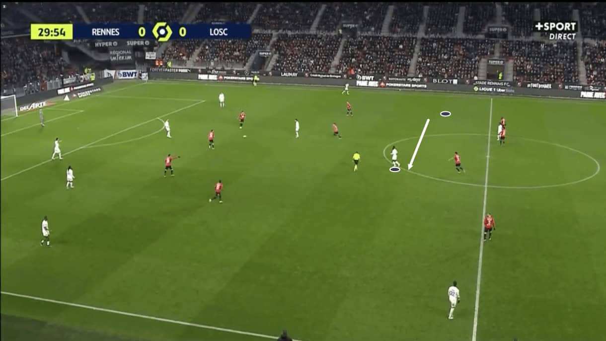 This change beefed up Lille’s midfield and meant that even if both of Rennes’ central midfielders dropped deep in the progression phase, There would still be one behind them protecting space that could open up in between the lines. With one of Rennes’ centre-forwards often dropping off in between the lines to exploit space — essentially forming a 4-2-3-1 — the 4-1-4-1 allowed Lille to guard against central overloads. Rennes did attempt to double-up on Lille’s deepest holding midfielder on a couple of occasions by dropping both centre-forwards and forcing an overload that way, but Lille’s compact shape and the pressure on the deeper Rennes midfielders still made this very difficult for them to pull off and they ultimately failed to do this effectively in the game, although it wasn’t a bad idea; they were just playing against a very well organised side.