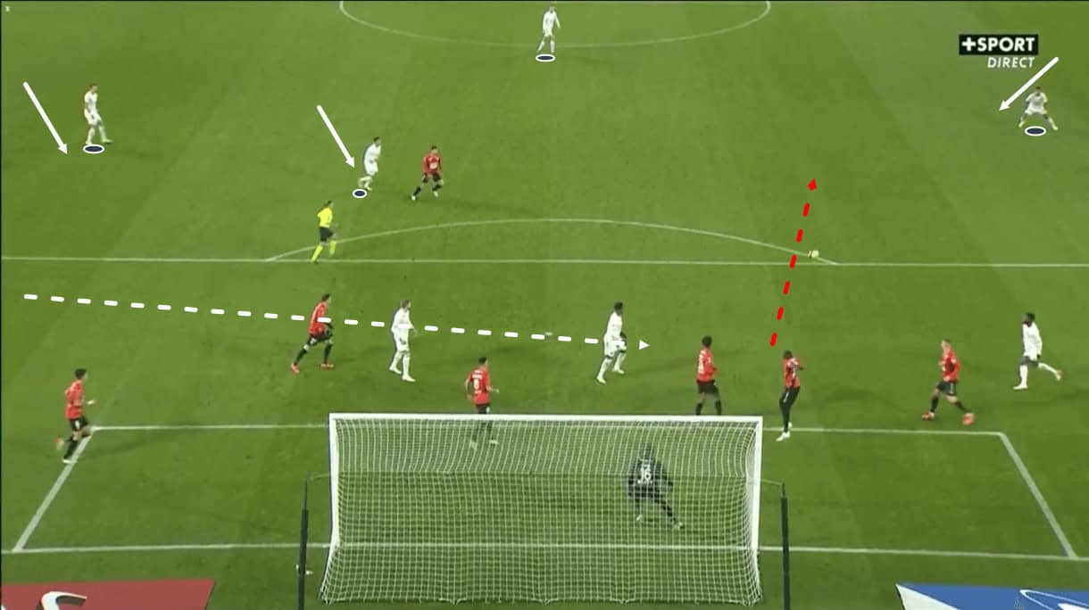 Just out of shot here, higher and wider on the right-wing, was Lille’s right-winger Weah. As play moves on from here, Djaló and Weah combined on the right wing to create a 2v1 against Rennes’ left-back, which resulted in a cross and a goalscoring opportunity. That wasn’t the only instance of a goalscoring opportunity being created for Lille via an intelligent switch in this game. It was a very effective tactic that Les Dogues deployed to take advantage of a clear weakness in their opponents’ marking system.