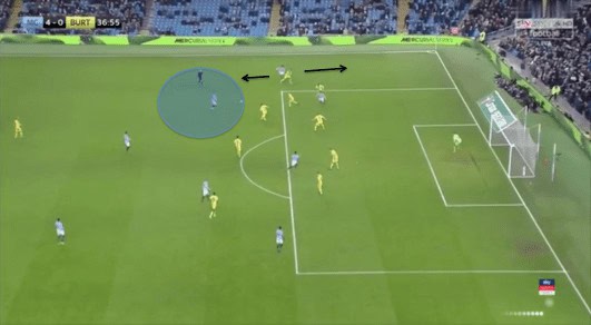 With Sane and Mahrez playing high and wide, they were able to stretch Burton’s back six horizontally, denying them the depth in other areas of the pitch. The inside channels were left vacated, making it difficult for any defensive player to get out in time to reach any player in possession in this area.