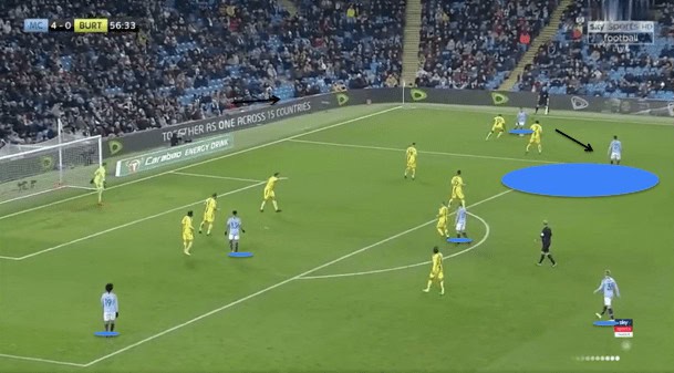 By having no players positioned there, Pep Guardiola’s men used these zones as areas where the most danger can be created. It is a space where it is difficult to find players to defend as it is positioned between two or three players. If a defending player comes out to defend a player in the half-space, the space that was supposed to be occupied was now vacated. This enabled Manchester City to pull the Burton players out of position, playing quick combinations to find the spaces in behind. As the game progressed, Pep Guardiola realised the key areas in which his team were operating, and ordered at least two players to support the player in the area, giving him good options in a position where space was afforded.