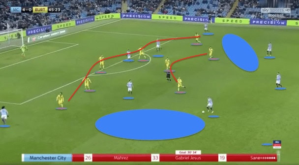 With the pace of Sane and the passing ability of De Bruyne and Silva, it would have been a risky tactic to adopt by Burton. However, a tactic we’ve seen by all Pep Guardiola teams were the unselfish runs that his wide men make. With Sane and Mahrez’s runs taking away two players at a time, Zinchenko, Walker, Silva, and De Bruyne had a 4v3 numerical advantage, allowing them to move into the spaces in the inside channels to make the penetrating passes they were looking for. This created several opportunities down the side and through the middle for Gabriel Jesus, who scored four.