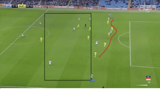 As we can see in the image above, both wingers were mainly left to play on the shoulder of the last man at different points in the game. The runs they made forced Burton to sit deeper and stopped them from pushing up comfortably, worrying about the space in behind.