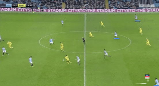 All the different movements and patterns of play that Manchester City demonstrated in the game were to vacate the half-spaces for David Silva and De Bruyne to occupy. With Burton playing a line of six and three in midfield, the spaces emptied were ones that were usually going to be taken by a defending winger.