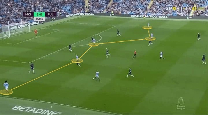 Pep Guardiola has a reputation as a tactical mastermind who tweaks his side in previously unseen ways. Against Fulham, however, he set City out in a classic 4-3-3. The back-four picked up fairly standard positions and the wingers hugged the touchline. In midfield, Fernandinho sat deep with the two Silvas, Bernardo and David, played in each half-space.