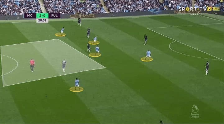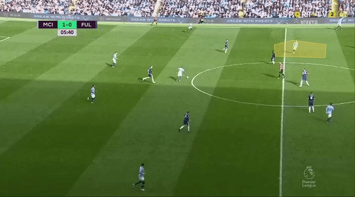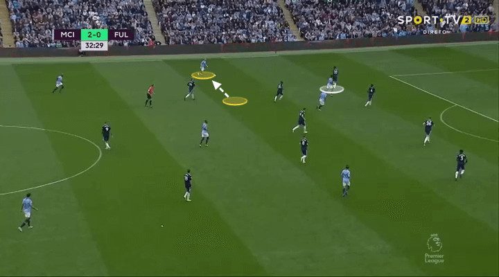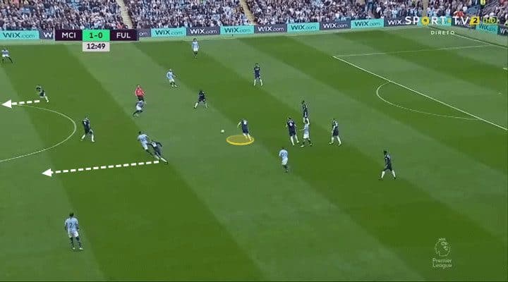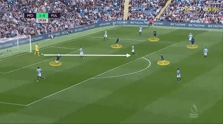 Fulham were confident and really tried to play their way forward. Unfortunately for them, they lost the ball when trying to build an attack after just 75 seconds and City countered to score the opening goal. City routinely pressed high, as seen below, but often left space behind the initial press and Fulham did break the press on a number of occasions.