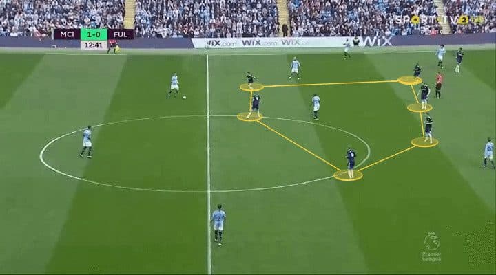 Fulham lost 3-0 and therefore failed to score. They did, however, create chances and their defensive setup might be something more clubs will take note of. Manchester City’s ability in possession was demonstrated again and again though, and never more so than in the build-up to their second goal. In the below image we see how Fulham press City very high. There’s five Fulham players in and around City’s penalty area. Ederson remains calm, finds Fernandinho who turns out of pressure and continues the attack. A few seconds later Bernardo has time and space in midfield and at the end of the attack, David Silva has made it 2-0.