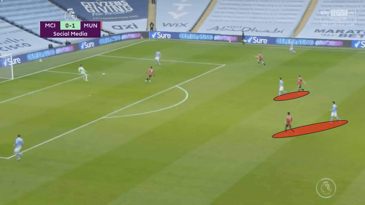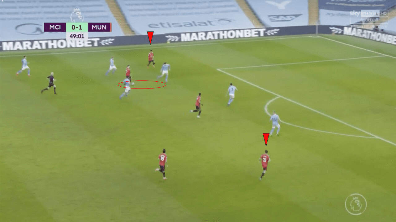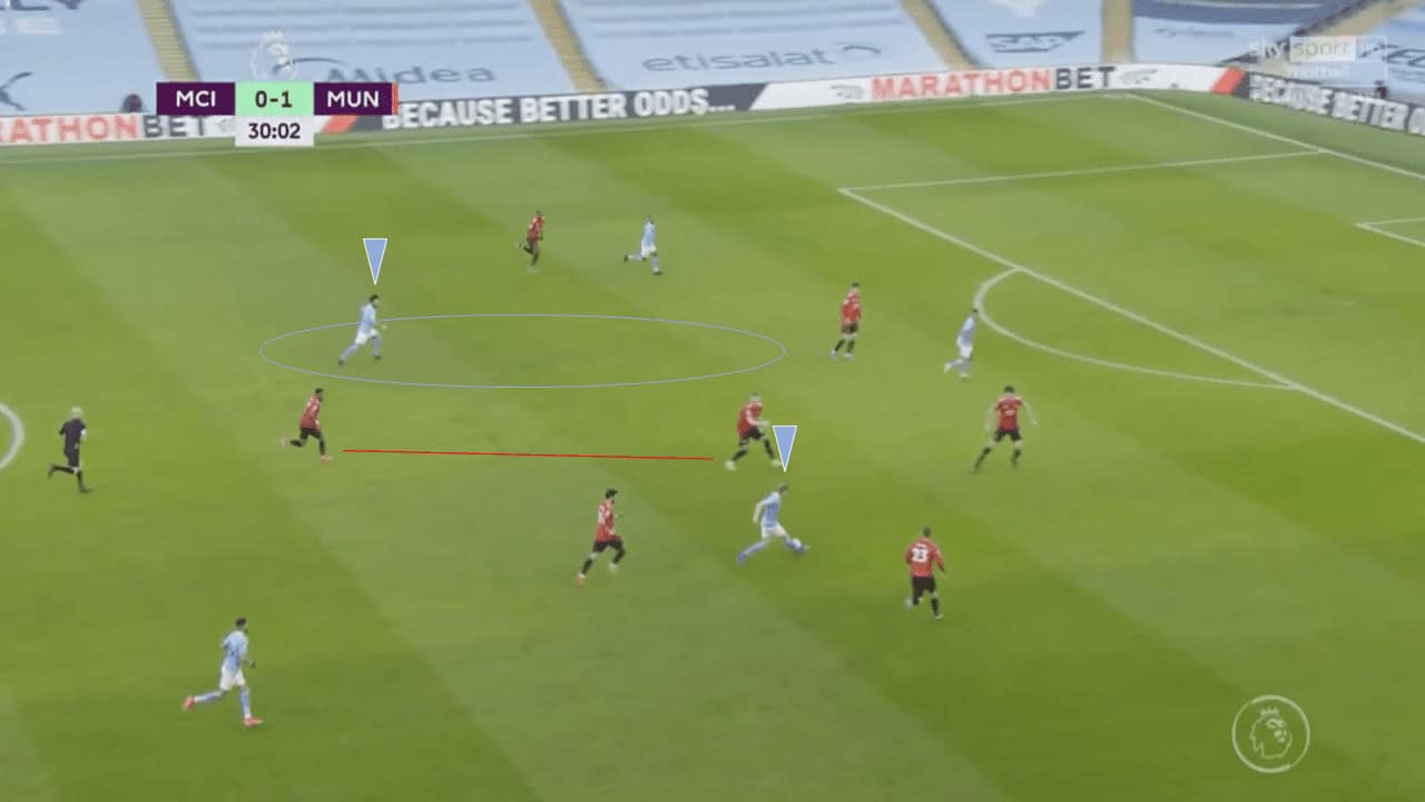 United also did appear to shoot themselves in the foot at times, with Fred and McTominay not being able to effectively pass the ball out of midfield. They were often dispossessed, allowing City to come at them quickly and finding gaps in midfield where one of the central midfielders should have been. Fred or McTominay would be caught out of position, as shown above, and the defence would have to be properly positioned to ensure that they can cut out the passing lanes.
