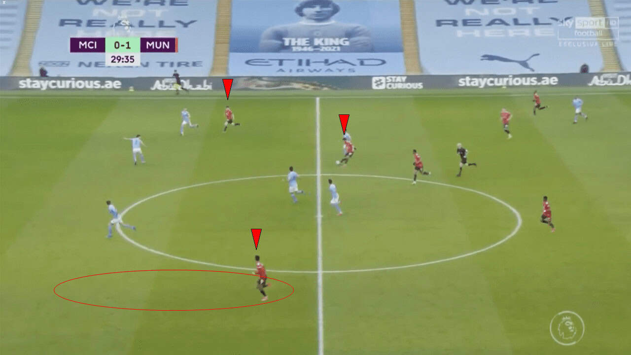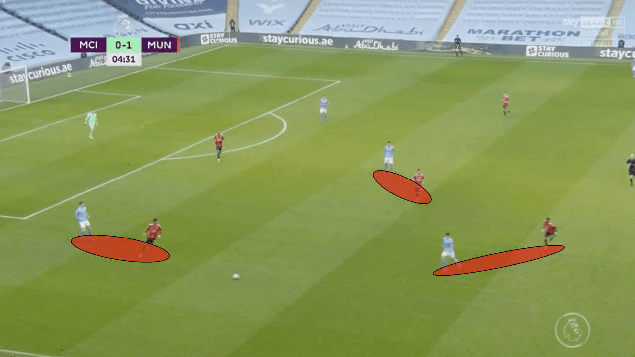 James and Martial would run and apply pressure on the ball-carrier, with the other two sticking to their men to prevent City from advancing through the middle. Cancelo had been a major asset this season owing to his attacking ability and it was clear that United were looking to stifle him as much as possible.