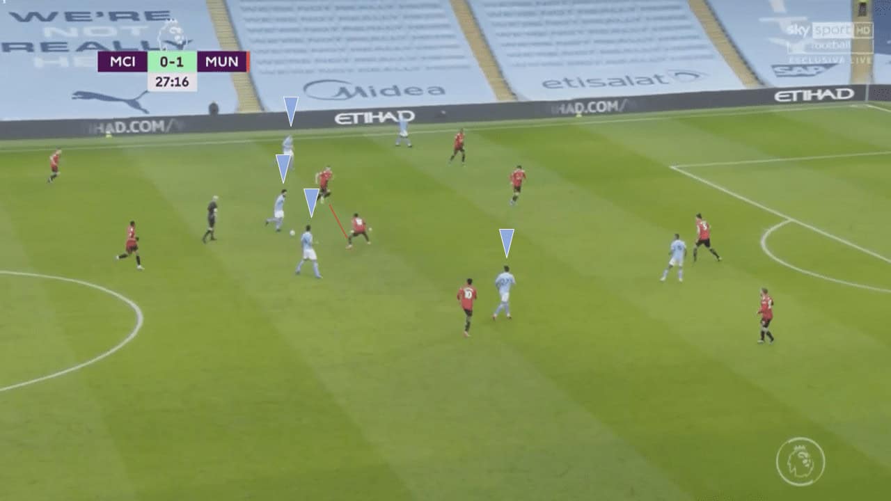 However, City still aimed to create numerical superiority in midfield, with Gündoğan and De Bruyne dropping into midfield to support Cancelo and Rodri. United often found themselves in a 4v3 scenario in such cases, with only Fred and McTominay compact in midfield with one of the front four dropping in to help them. The backline could not commit owing to City’s front three looking to run in behind and should one of the defenders commit, an attacker could find ample space to move into.