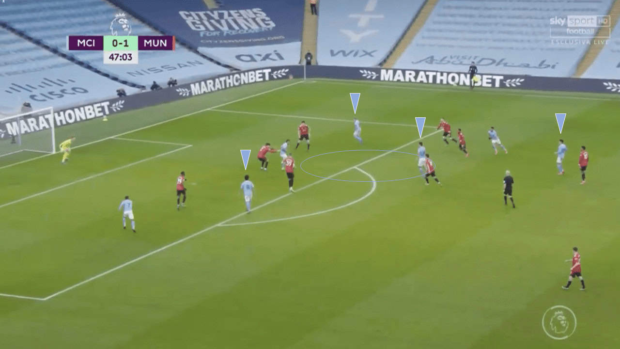 Gündoğan and De Bruyne aimed to exploit as much space as possible in such situations but United’s work rate off the ball was impressive, with the side quickly getting numbers behind the ball and thwarting the City attacks. Although this happened on a few occasions, City were unable to capitalise.