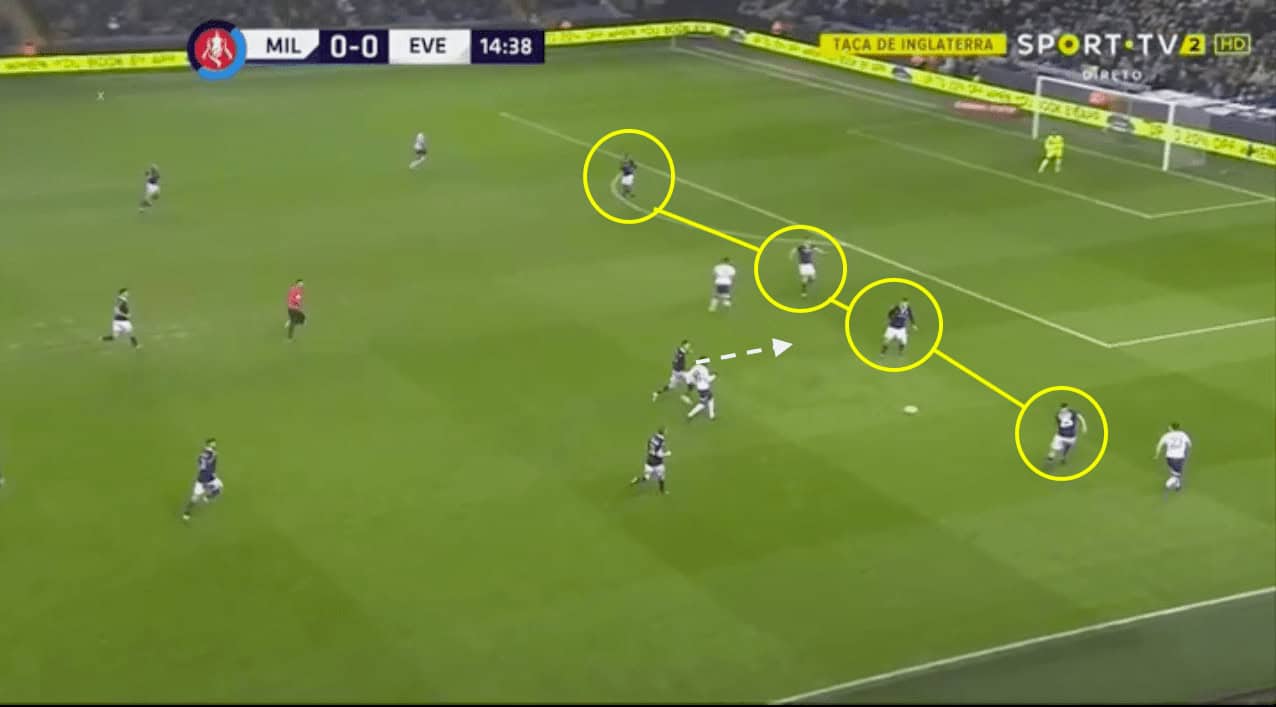 As the above and below images show, Digne on the left and Coleman on the right make runs down the line before trying to cross to the attacking midfielders and Calvert-Lewin. Their attacking intentions are strengthened by the upcoming defensive block of Andre Gomes and Gueye.