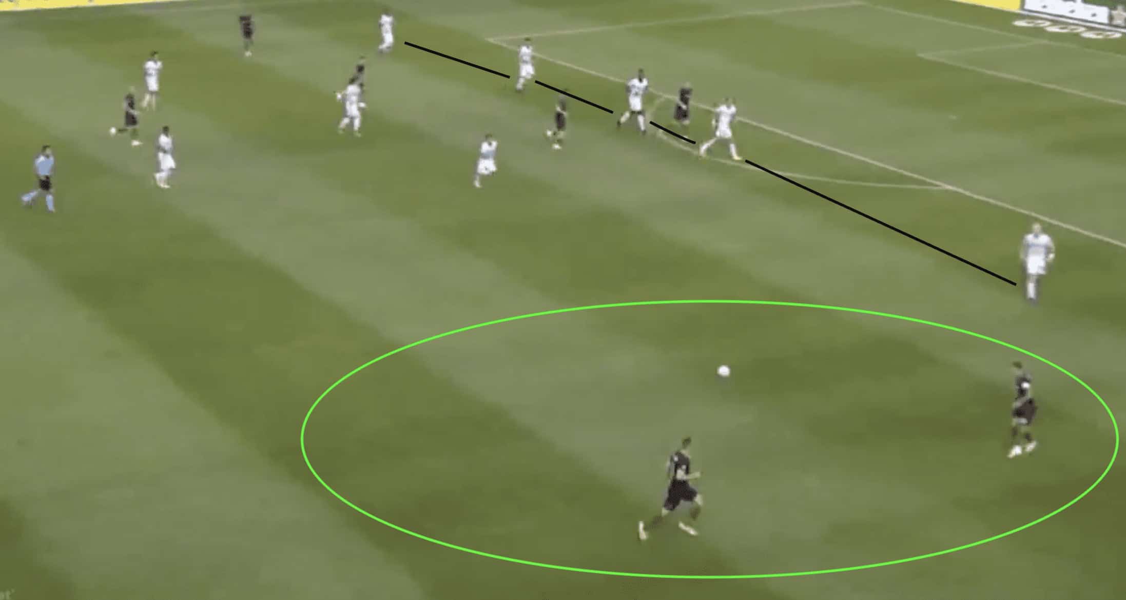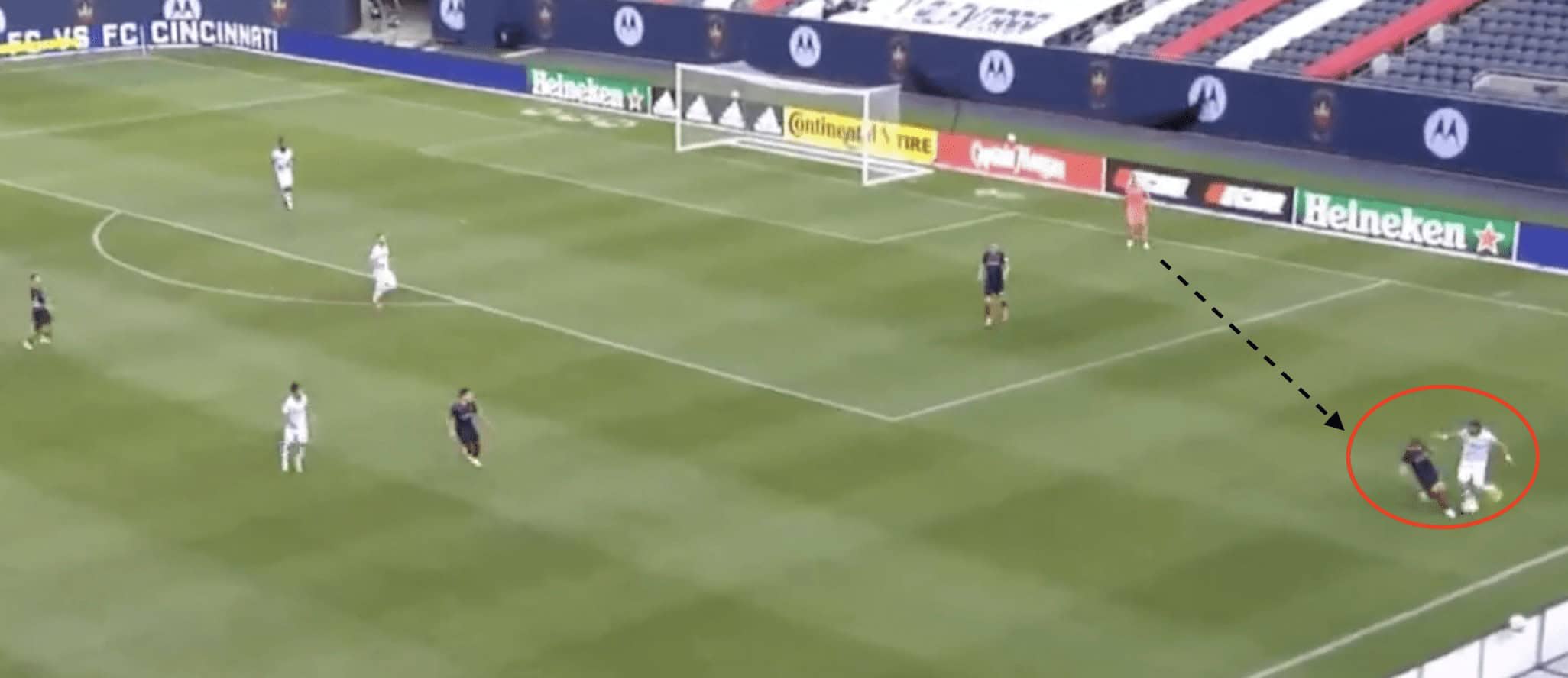 In this example, the Chicago Fire is building up play towards Cincinnati’s goal. The defensive line is in a flat 5 back while the wingbacks are being pulled back instead of in the midfield areas. This creates a lot of space for Wicky’s men to push forwards towards goal and float in dangerous balls in and around the box. This is how the first goal was scored and how another goal that was disallowed originated from.