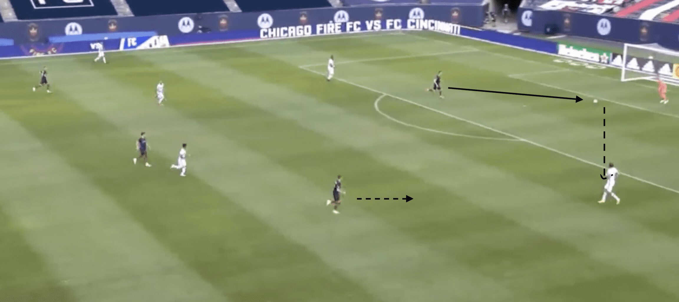 The analysis below shows how the Fire’s pressing trap develops. Berić is far from the ball but had instructions (before the match) to initiate the pressing trap. He sprints towards the Cincinnati goalkeeper who is forced to make an early pass to the outside centre-back due to the immense pressure.