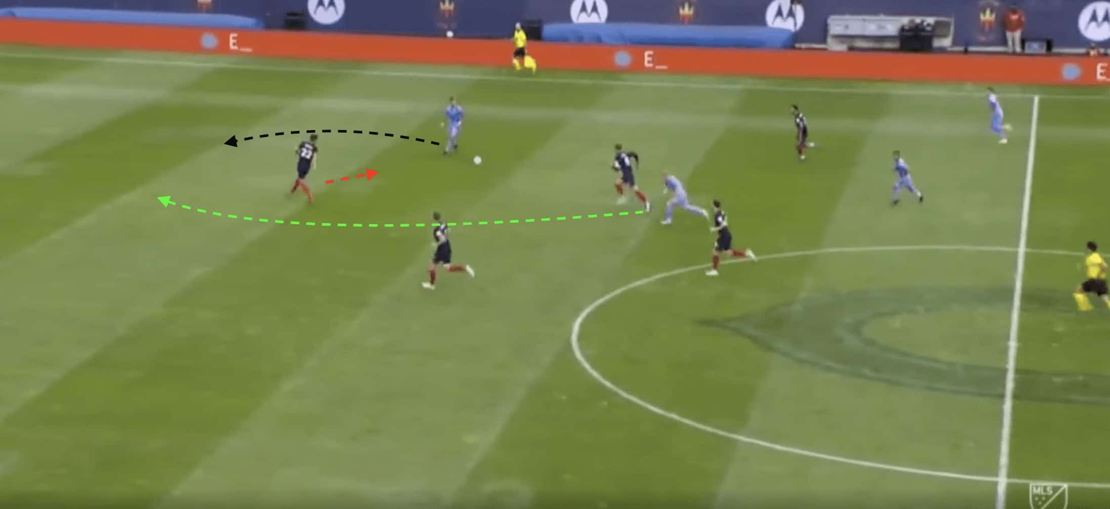 This led to the Fire’s centre-backs having to second-guess following the runner. In the analysis below, Castellanos again causes problems. This time, he received the long ball and waited due to Mackay-Steven’s forward run. The Argentine draws in the Fire defender, allowing for the Scottish winger to get in behind. Castellanos then plays a delightful through-ball, which leaves Chicago exposed.