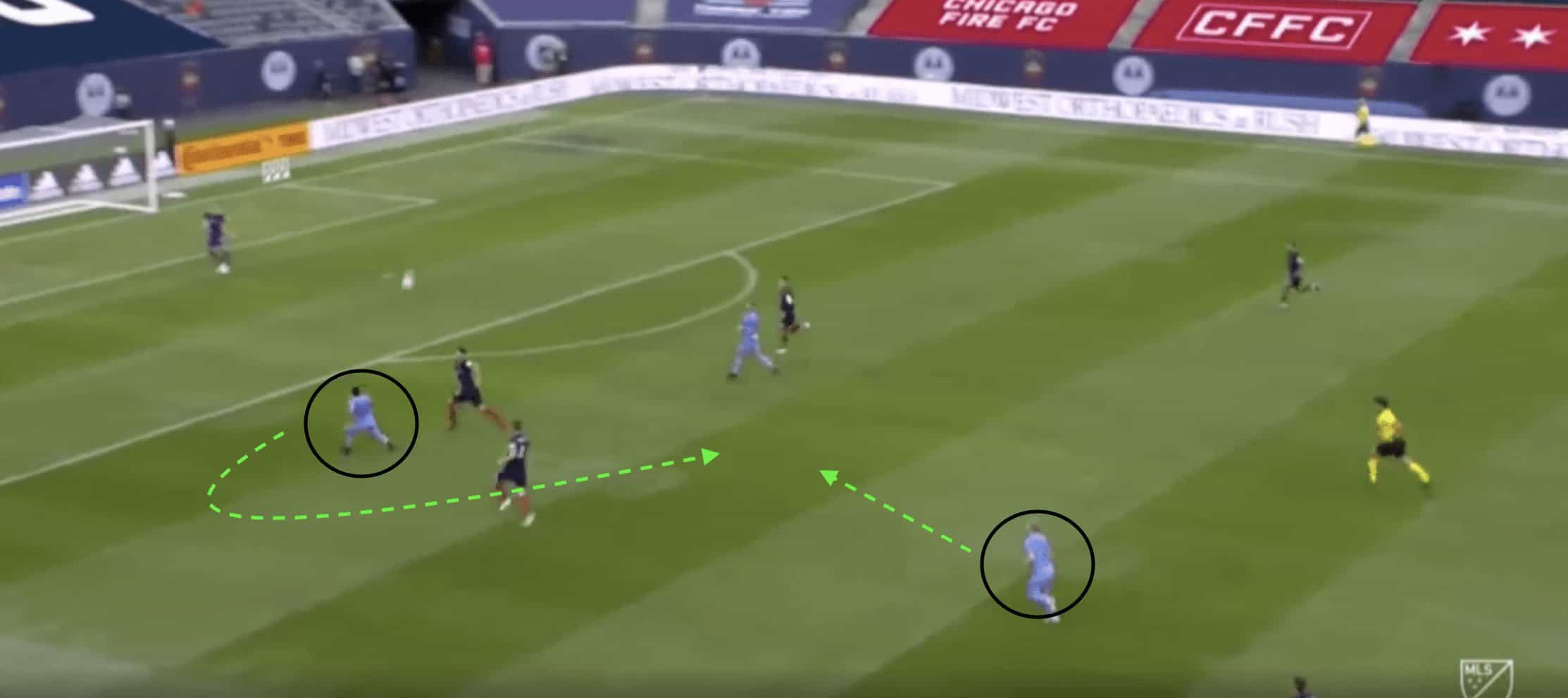 This tactic effectively solved the problem that NYCFC faced during the match. They had to find a way to break past the press of Chicago, but that was not always easy. However, with effective long balls, they were able to release the press early and take advantage of the Fire’s spacing problems.