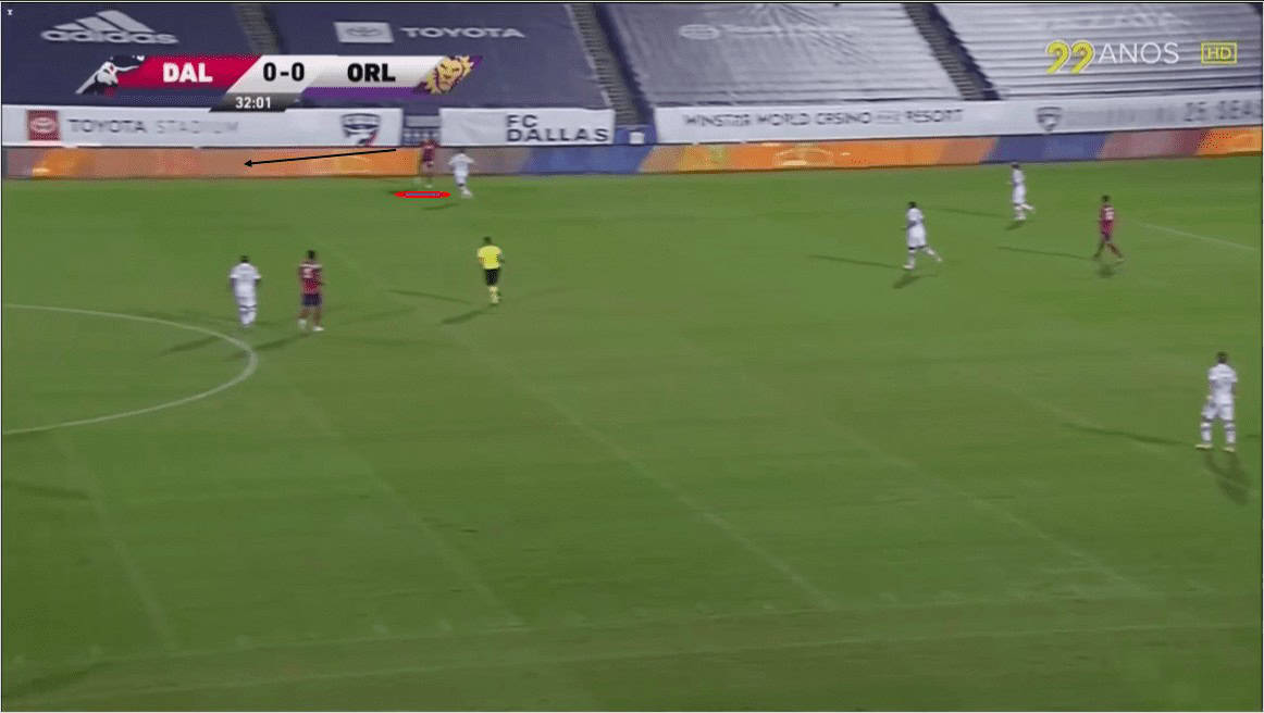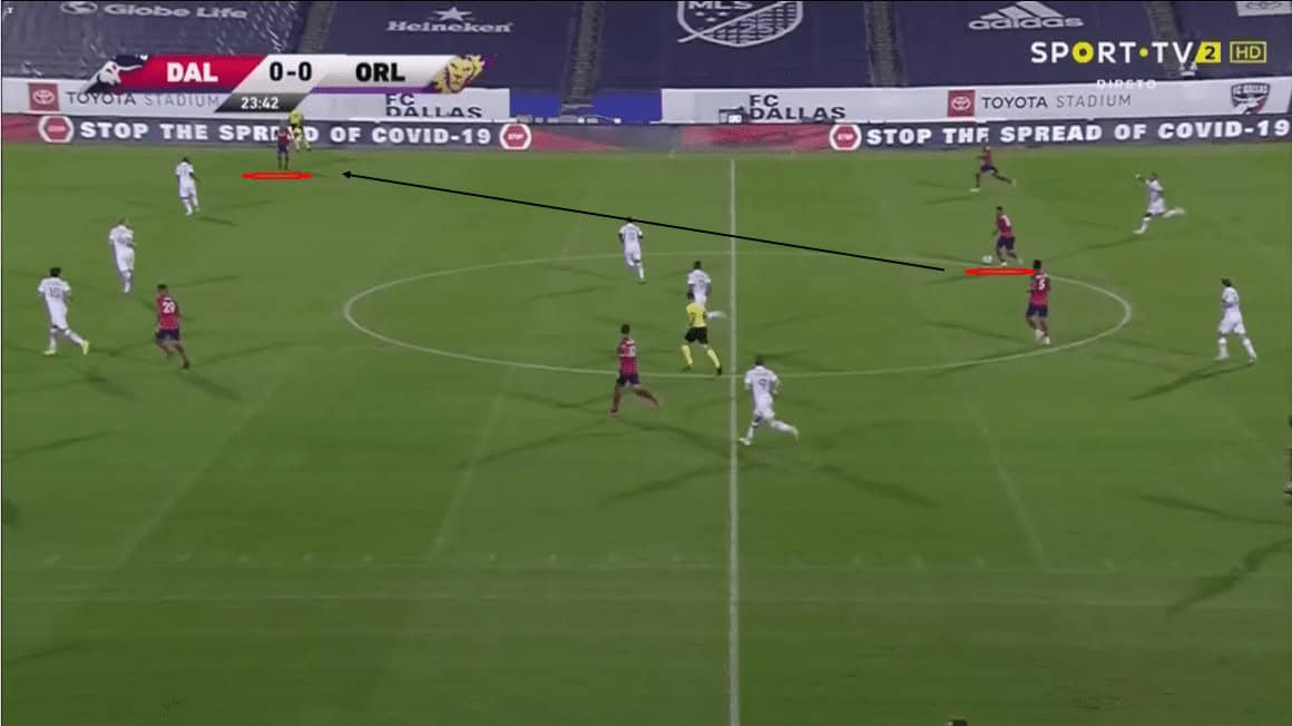Reynolds is able to play a cross into Jara, but it is cleared away by the Orlando defenders. Dallas attempted to break the visitors down by repeatedly isolating the left-back in a 2 v 1. Orlando however, was able to deal with the crosses into their penalty area.