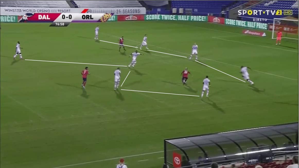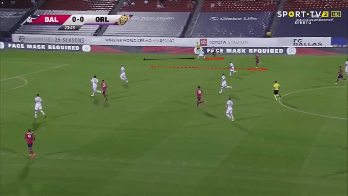 The aim with their heavy press was to force Dallas into inaccurate long passes, which could be won at half field. Using the following example from the first half, we see Orlando’s high press against Dallas in action.
