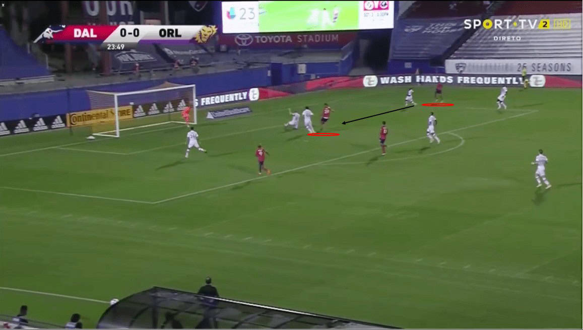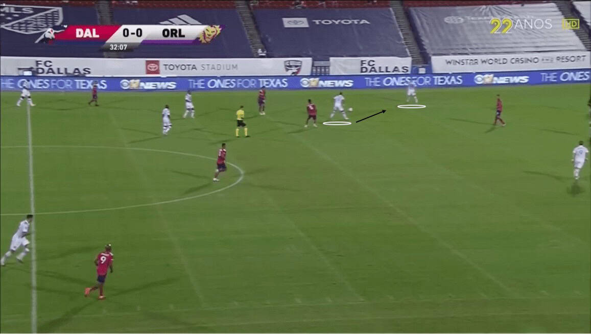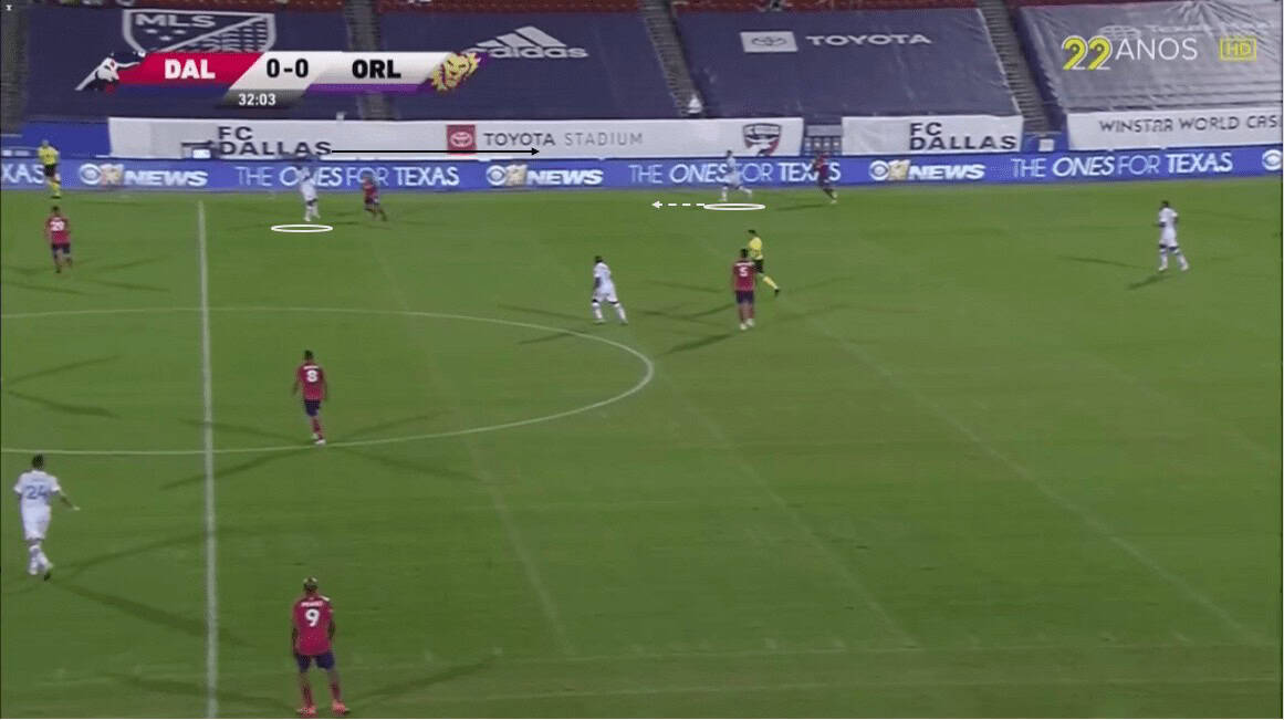 Using the following sequence from the first half, we can see an example of how Dallas would quickly break out on the right-hand side against Orlando. After receiving a pass beyond Orlando’s first line of pressure, Acosta quickly picks out Berrios who is higher up the field.