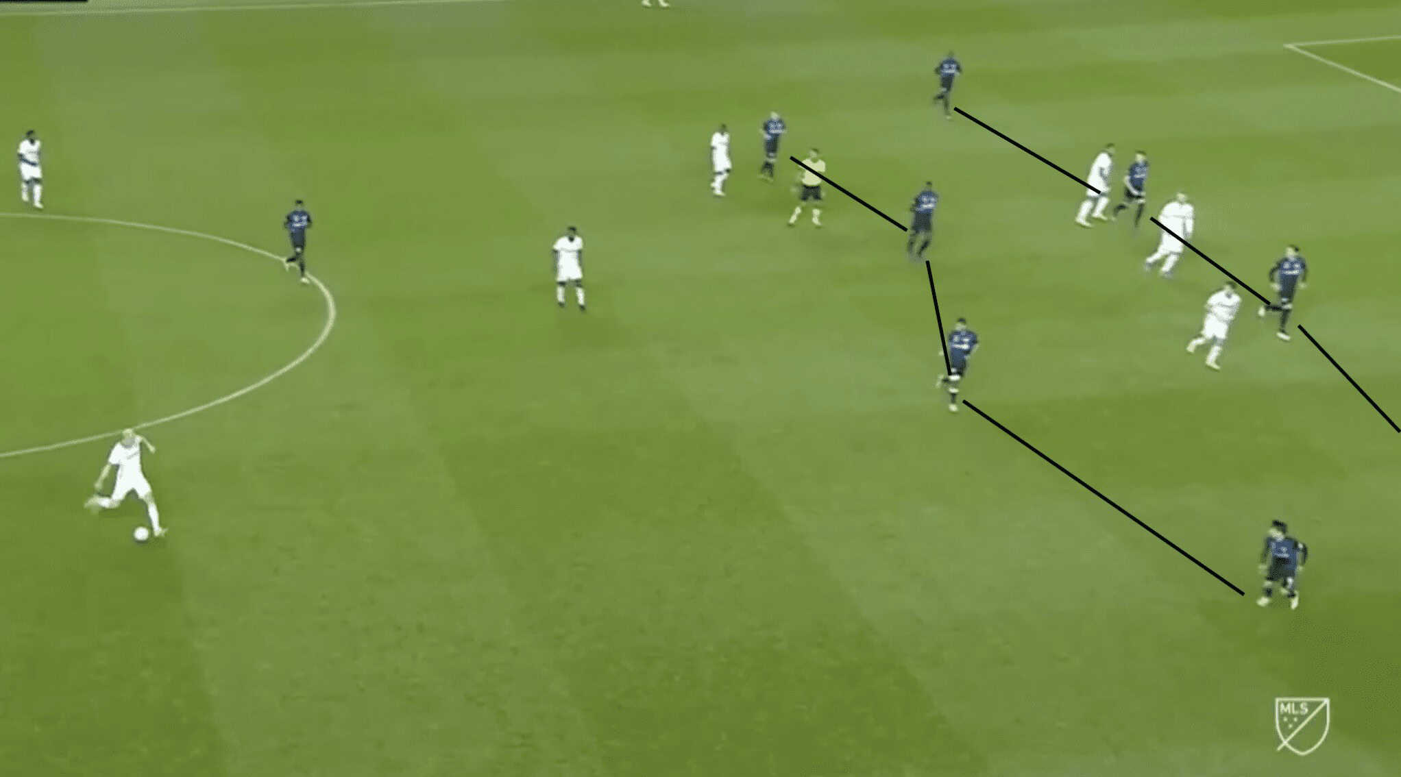 In the case of the Montreal Impact, their defenders did not do this and switched off too many times throughout the match. A prime example of this occurs as the Union forward makes a fairly simple run off of the Impact centre-back. Here, there is far too much space between the defender and attacker who is making the progressive run who is allowed to push forward into the space with ease. The striker is practically in between both defenders which is extremely dangerous. With the right delivery, this action could easily lead to a goal.