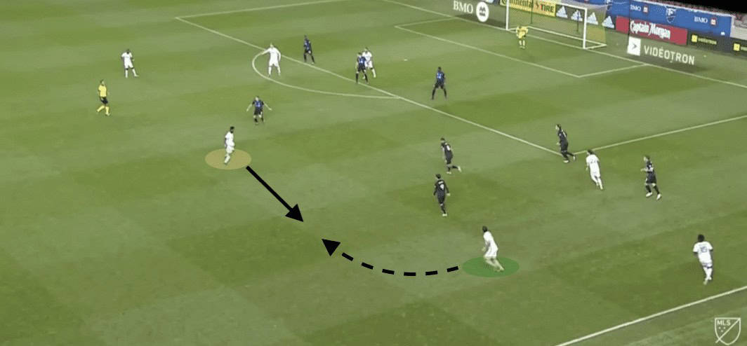The analysis below shows the beginning of a passage of play that was almost routine for the Union throughout the match. It is important to take into account the defensive shape of Montreal in these moments. They are doing everything to clog up the middle of the pitch in a low block. This has two advantages. By covering the middle, they are eliminating the quickest route to the goal and most dangerous area of the pitch. The second advantage is the possibility of the counter-attack if the Union got sloppy in possession.
