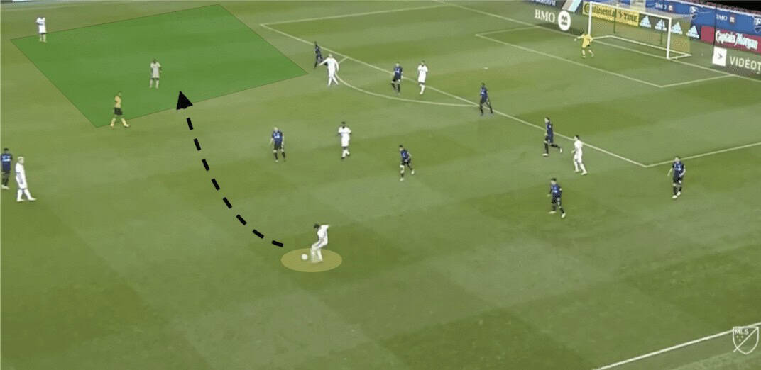 The analysis below will look into an example that created a goal for the Union. In the wide area, the winger Alejandro Bedoya plays it into Aaronson who is surrounded by Impact players. At this moment, Montreal covers the channel well. However, what is not covered well is the central midfielder, Warren Creavalle, who is standing in acres of space. Because the shape of the Canadian team is pulled from its compact nature, opportunities open to change the point of attack quickly and in a devastating manner.