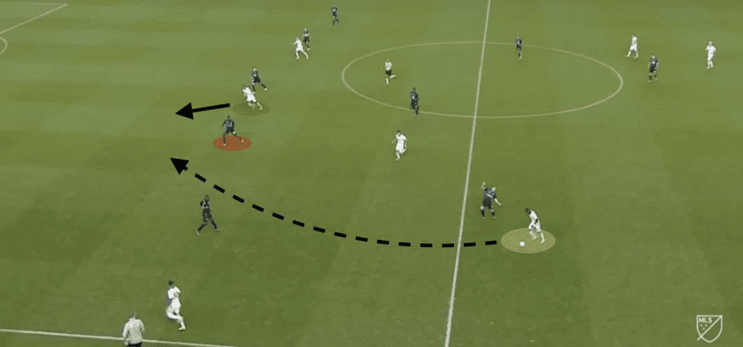 Bedoya then plays the ball into Creavalle and follows his pass but moves to the left of the defender. This pass successfully splits the press and moves the ball into the midfield. Here, the Impact players try to make up for the breakdown in shape by pressing Creaville who then lays the ball into Bedoya’s overlapping run in order to switch the ball to the other side of the pitch. As you can see, the Union has players loaded on the left side ready to attack the space they uncovered.