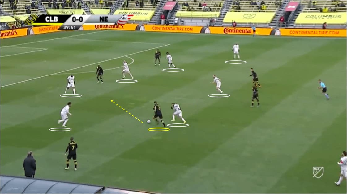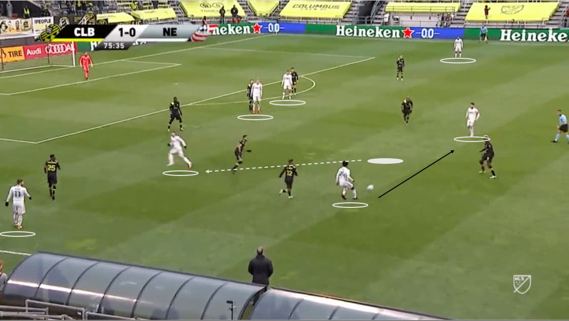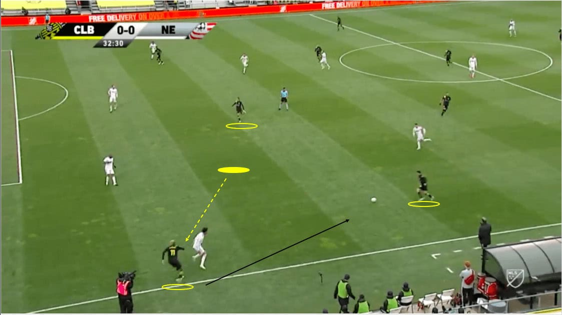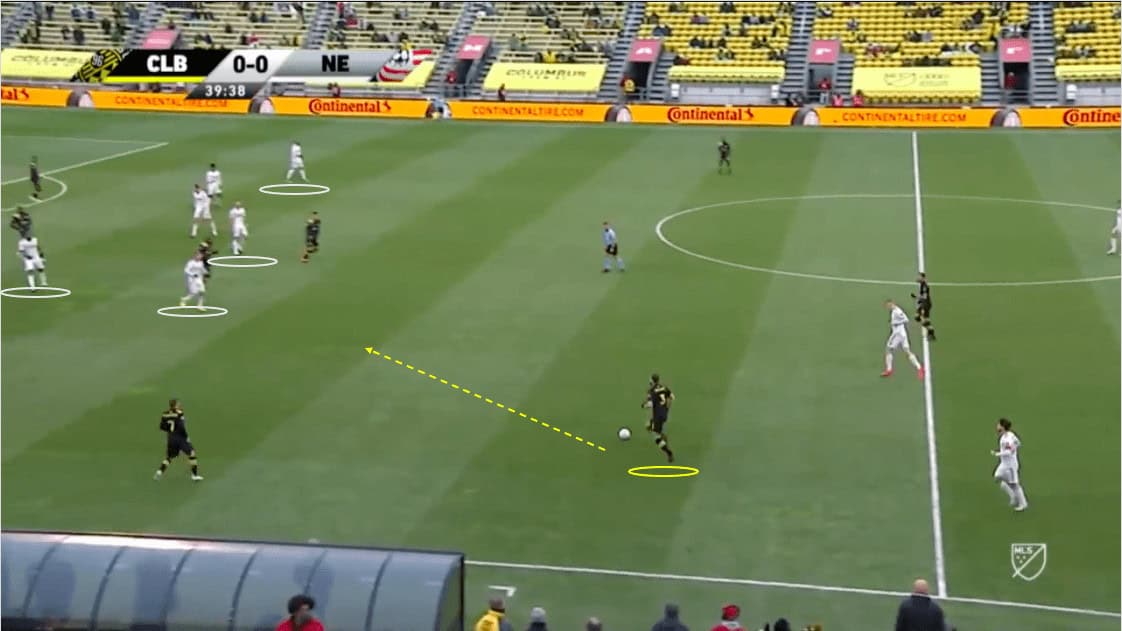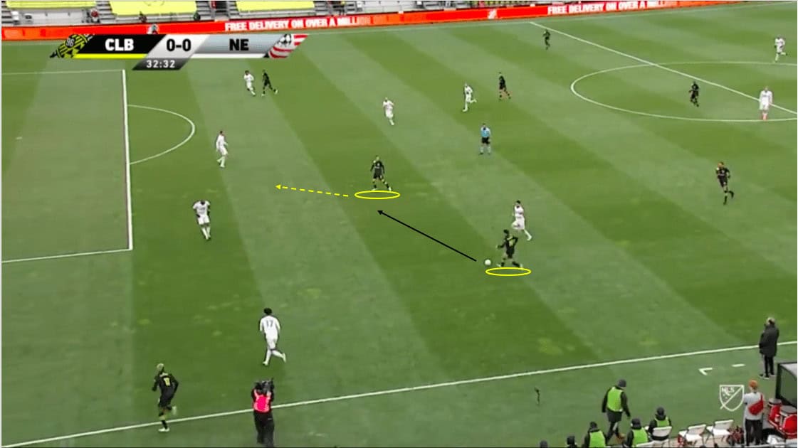 This defensive spacing played right into the Crew’s hand. With their play being more direct, they were able to cut through the Revs defence time and time again.