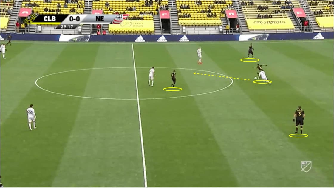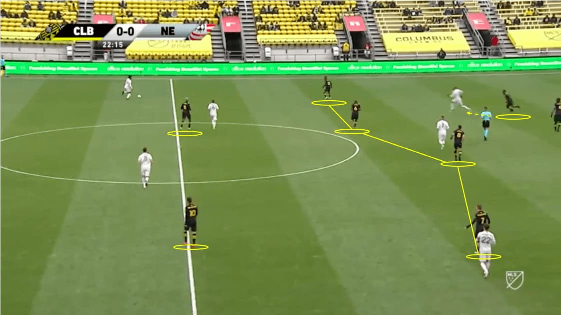 Again we can notice the massive gap between the lines, which allows Williams to dribble at the first line of defence. New England also allows the centre back to arrive near the penalty area under little pressure. While his pass to Zardes results in an offside, the Revs lack of compactness let Columbus make the same exact play twice in less than a minute.mls-eastern-conference-final-2020-columbus-crew-vs-new-england-revolution-tactical-analysis-tactics