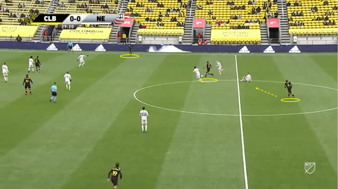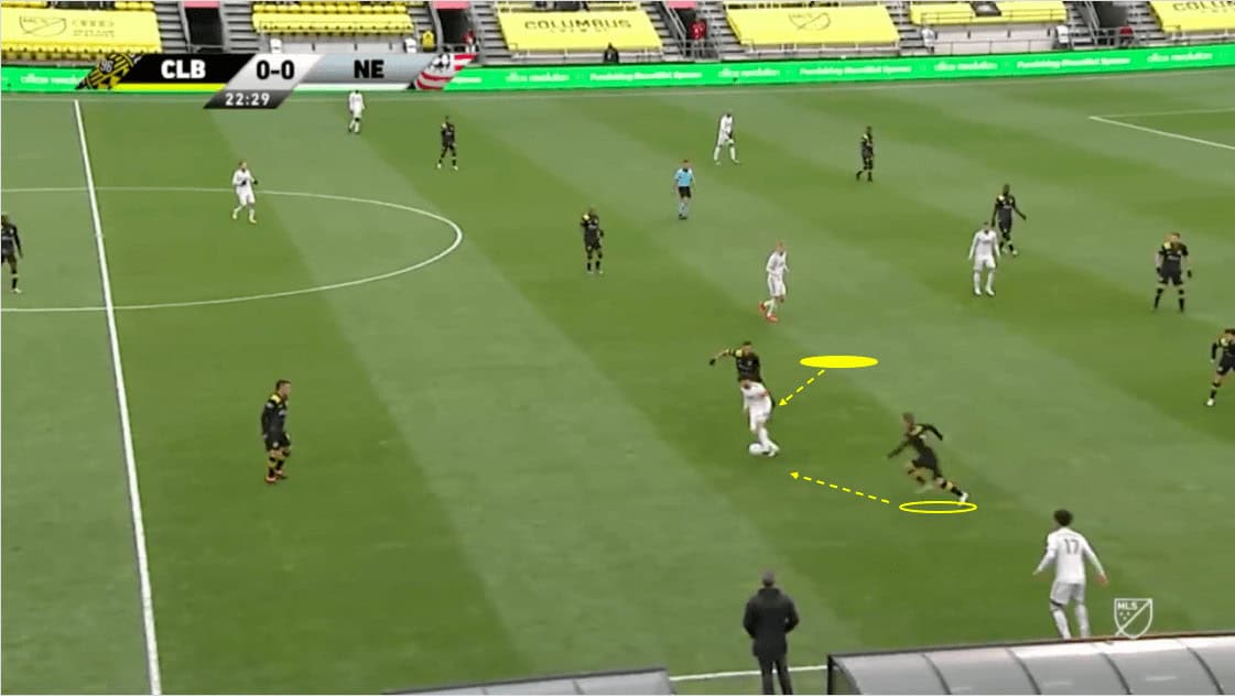 While that happens, the other midfielder would drop slightly to provide support and balance the counter defence.mls-eastern-conference-final-2020-columbus-crew-vs-new-england-revolution-tactical-analysis-tactics