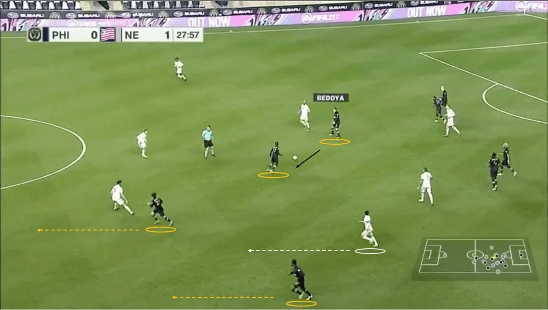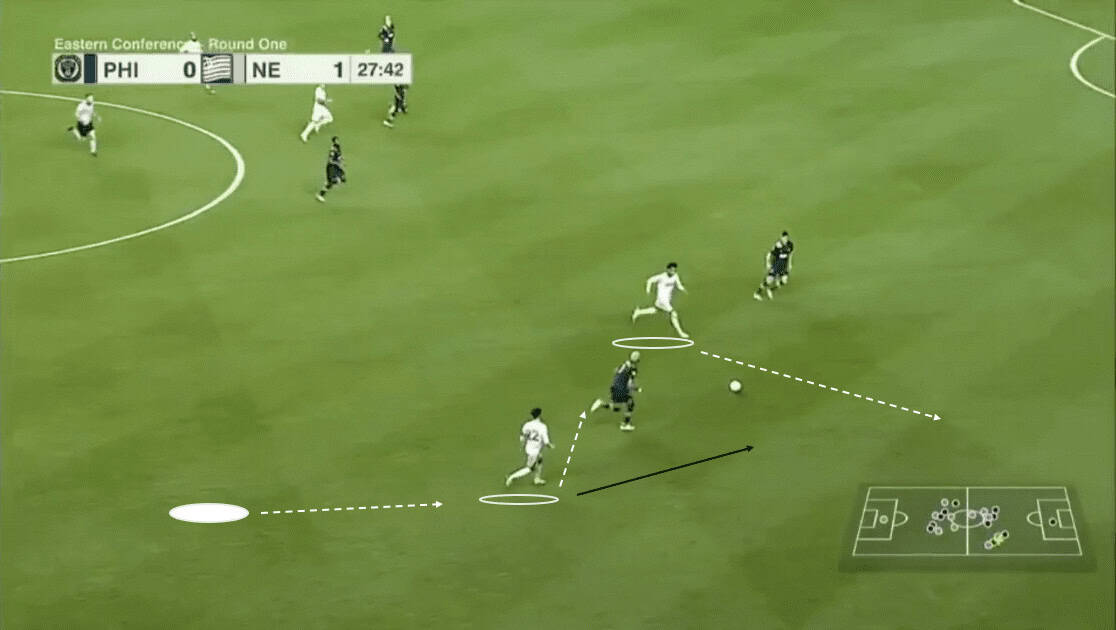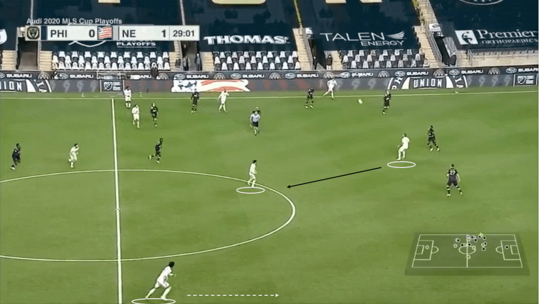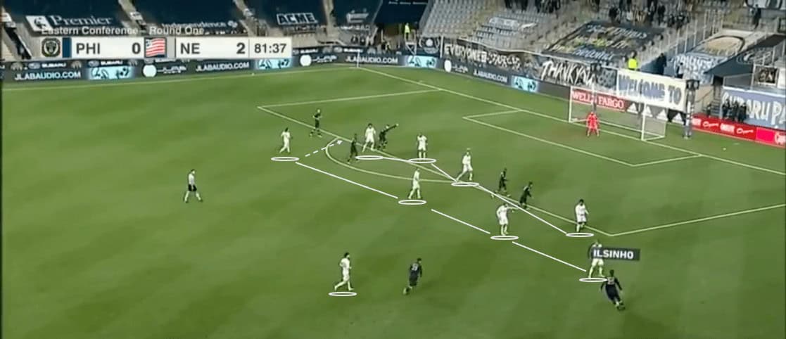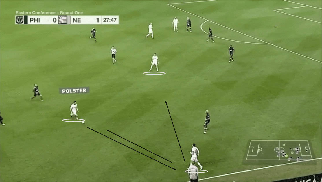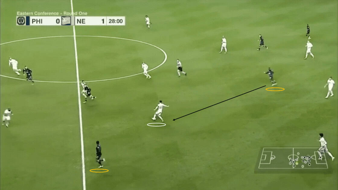 As we can see above, the Revs have shifted to their left. Since Philly’s far side wing-backs have pushed higher, New England can afford to drop a winger to help defend. This tactic created a numerical advantage for the visitors.