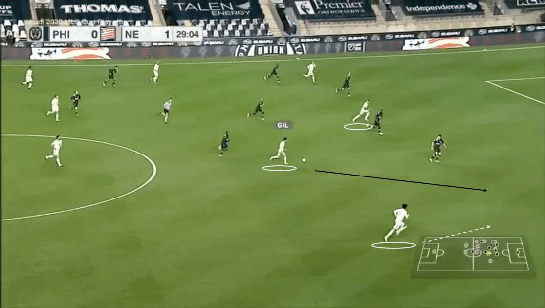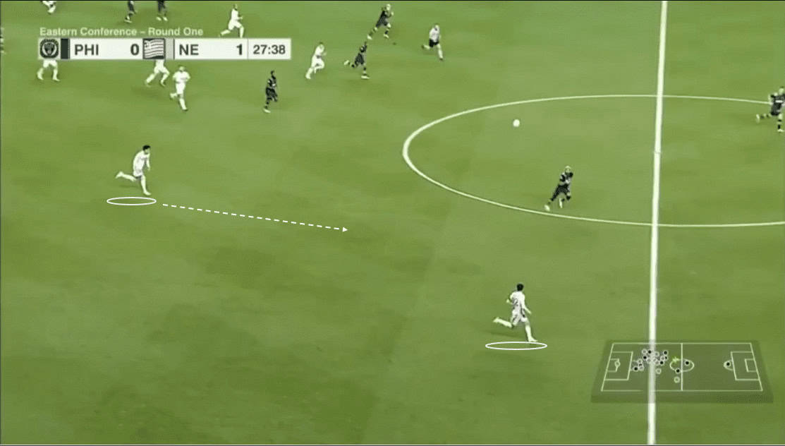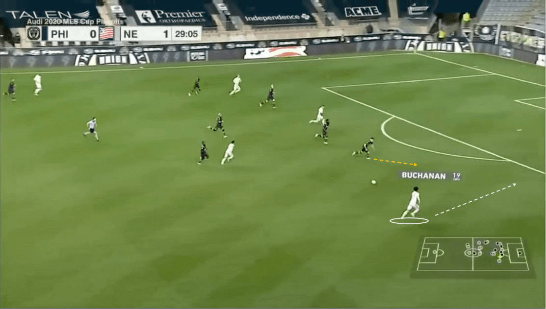 Using his pace Buchanan underlaps Gil, who has dribbled wide to draw the defender with him. Again we have an example of how New England utilized Buchanan’s speed to exploit the space left by the Union wing-backs.