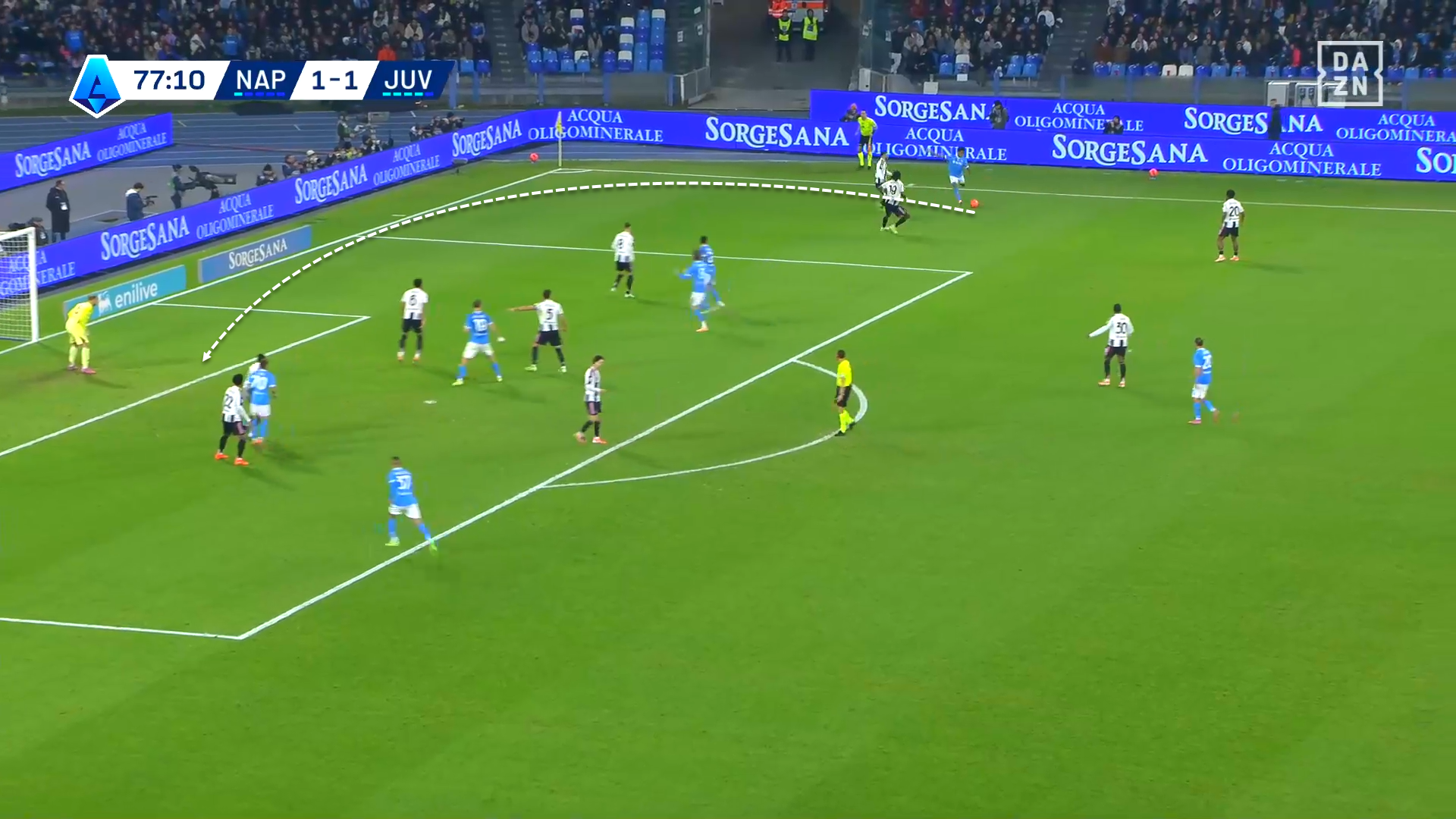 Following Juventus’ equaliser and their attempts to gain more possession and score the second goal, Napoli continued to rely mainly on their attacking transitions and dangerous crosses, especially from Neres’ side.