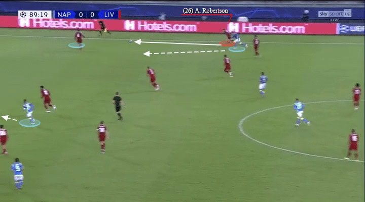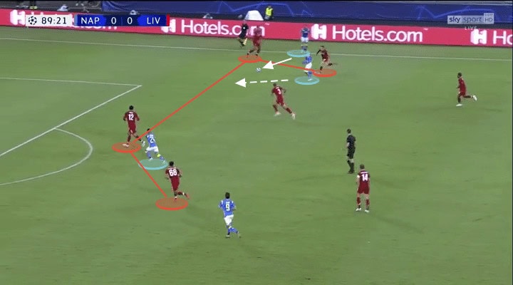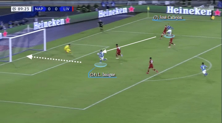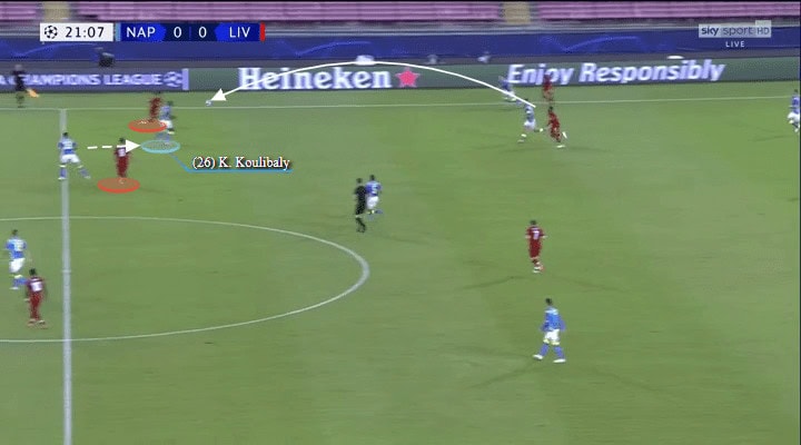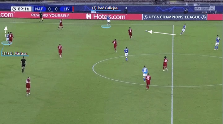 The very mobile Dries Mertens had replaced the more static Milik as Napoli’s #9. Here he makes a well-timed dash to the right flank, dragging Virgil van Dijk with him and carving an opening in the Liverpool backline.