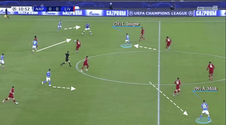 When playing with two forwards both in and out of defence and looking to dominate possession, you need one of them to drop a little deeper than the other so that you don’t get outnumbered in the middle. Lorenzo Insigne filled this role for his side against Liverpool, helping the midfield advance the ball into the final third while also helping to pressure the opposition’s midfield when Liverpool had the ball.