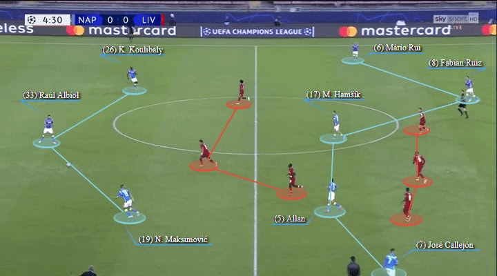 Mario Rui was the busiest man on the night covering the entire left flank on his own for Napoli as Fabián Ruiz moved into a more central attacking midfield role in possession. In contrast, right-back Maksimovic remained alongside Raúl Albiol and Kalidou Koulibaly at the back ensuring the Napoli backline was never outnumbered by the pacey, dangerous Liverpool front three.
