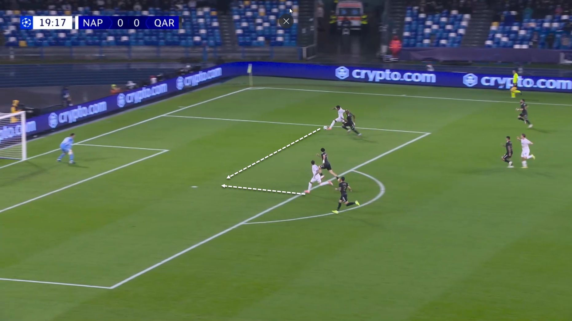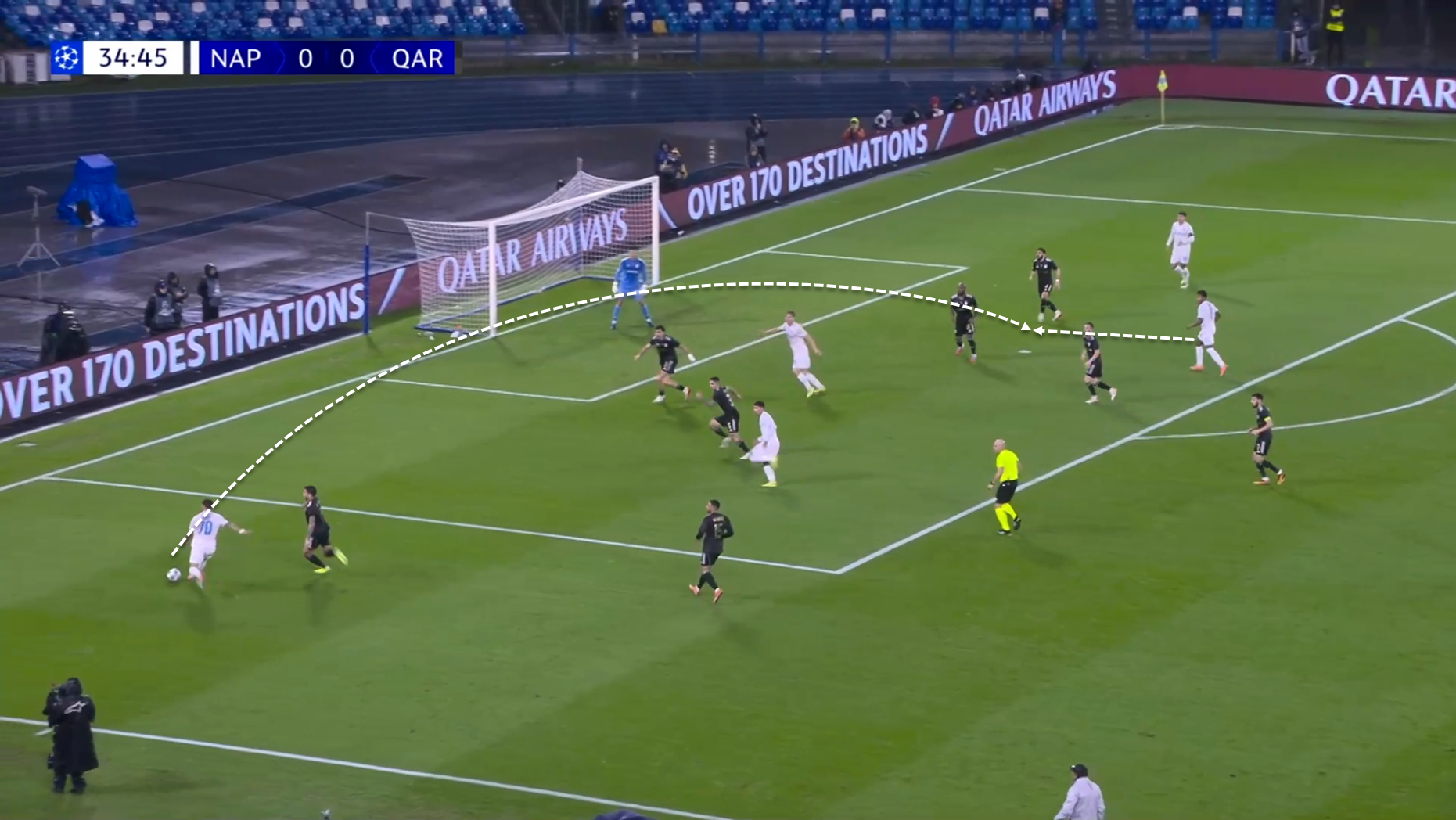This was a recurrent key tactic in the match as Napoli created a large part of their attacking actions thanks to crosses that surpassed Qarabağ’s defenders and reached Neres.