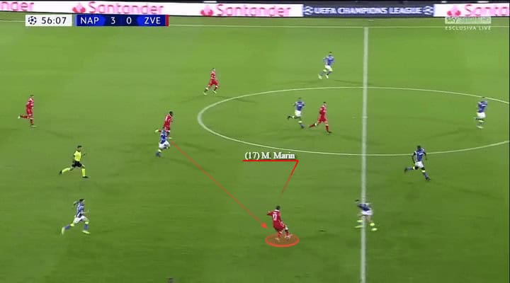 Napoli’s intensive press made playing out from the back very difficult for Milojevic’s men and only five minutes into the match, the Gli Azzurri pressure created the first big chance of the game.
