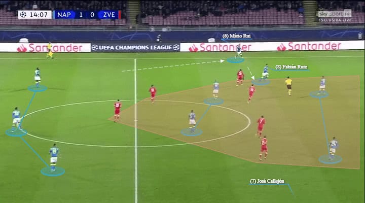 Left-back Mário Rui, just as he did against Liverpool in an earlier in Group C fixture, moves high and wide when his side regain the ball to occupy the opposition’s right-back, essentially playing as both a left-back and a left-winger.