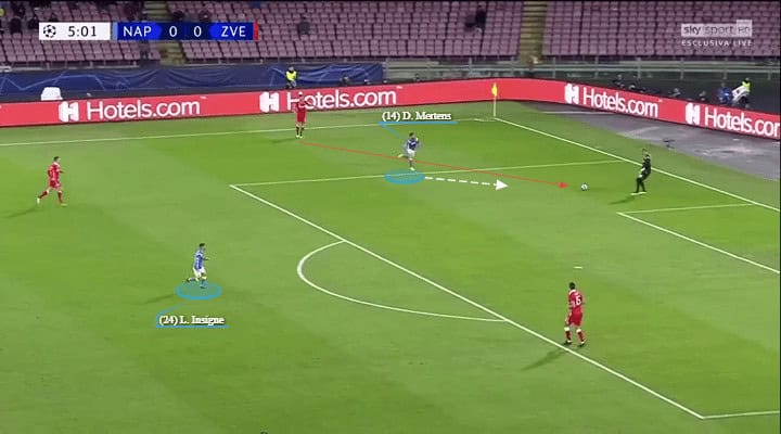 Strikers Mertens and Insigne occupied the crveno-beli centre-back pairing while Jose Callejón played wide in the right channel, marked by his opposite left-back.