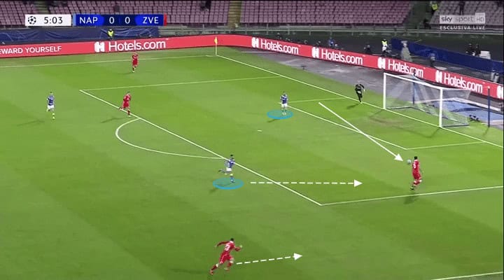 Red Star’s 4-2-3-1 medium block looked designed to allow Napoli space in wide areas, perhaps favouring themselves if they could resort the Partenopei mainly to crossing opportunities.