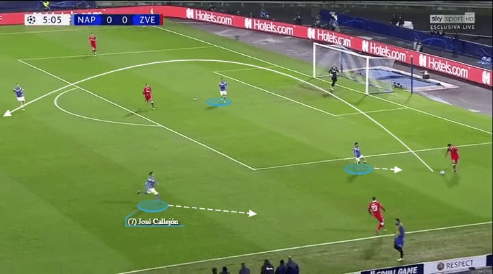 This 3-5-2 gave Napoli a lot of width as Rui and Callejón stretched the Red Star back four while Fabián Ruiz’s free role kept the crveno-beli defensive midfielders honest, Milojevic’s men were left with too many forward players to track.